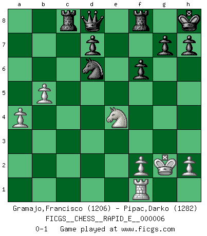 Last move : 0-1 2008 November 13 18:40:23 [Event "FICGS__CHESS__RAPID_E__000006"] [Site "FICGS"] [Date "2008.10.30"] [Round "1"] [White "Gramajo,Francisco"] [Black "Pipac,Darko"] [Result "0-1"] [WhiteElo "1206"] [BlackElo "1282"] 1.e4 e5 2.Nf3 Nc6 3.Bb5 a6 4.Bc4 b5 5.Bd5 Bd6 6.d3 Nf6 7.c3 Nxd5 8.exd5 Ne7 9.O-O Nxd5 10.b4 O-O 11.Bg5 f6 12.Bh4 Bb7 13.Qb3 Kh8 14.c4 bxc4 15.dxc4 Ne7 16.c5 Bd5 17.Qc3 e4 18.cxd6 exf3 19.gxf3 cxd6 20.Nd2 Rc8 21.Qd3 Be6 22.Ne4 Bc4 23.Qxd6 Bxf1 24.Rxf1 Nf5 25.Qxa6 Nxh4 26.a4 Nxf3+ 27.Kg2 Nd4 28.Qd6 Nf5 29.b5 Nxd6 0-1 Ruy Lopez (Spanish Opening) Kingside Castling by player White (move 9) Kingside Castling by player Black (move 10) Player Black won this chess game. Follow this game move after move (download)A win by an unsound combination, however showy, fills me with artistic horror. (Wilhelm Steinitz) Sehr viele beherrschen heutzutage das große Einmalseins des Schachspiels und kennen sogar dessen Logarithmentafeln auswendig - deshalb sollte man hin und wieder zu beweisen trachten, dass zwei mal zwei auch fünf sein kann. (Mikhail Nekhemyevich Tal) ¿Quién es tu oponente esta tarde? Esta tarde mi oponente son las piezas negras. (Akiba Rubinstein) Il vaut mieux sacrifier les pièces de l'adversaire. (Xavier Tartacover) The obstacle is the path. (Zen proverb)