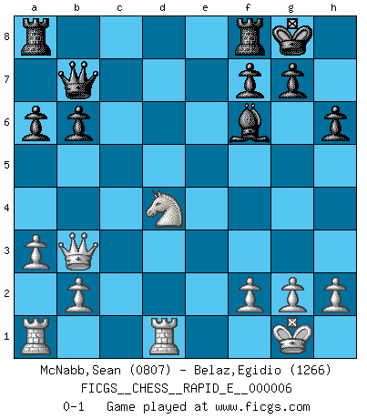 Last move : 0-1 2008 November 22 4:12:33 [Event "FICGS__CHESS__RAPID_E__000006"] [Site "FICGS"] [Date "2008.10.30"] [Round "1"] [White "McNabb,Sean"] [Black "Belaz,Egidio"] [Result "0-1"] [WhiteElo "0807"] [BlackElo "1266"] 1.d4 d5 2.c4 Nf6 3.Nc3 dxc4 4.e4 e6 5.a3 Be7 6.Bxc4 O-O 7.Nf3 Nc6 8.O-O Na5 9.Bb3 Nxb3 10.Qxb3 b6 11.Rd1 Bb7 12.d5 exd5 13.exd5 Bd6 14.Bg5 h6 15.Bh4 Re8 16.Nb5 Be7 17.Bxf6 Bxf6 18.d6 Rf8 19.dxc7 Qc8 20.Nfd4 a6 21.Nd6 Qxc7 22.Nxb7 Qxb7 0-1 QGD : Marshall defense Kingside Castling by player Black (move 6) Kingside Castling by player White (move 8) Player Black won this chess game. Follow this game move after move (download)The combination player thinks forward; he starts from the given position, and tries the forceful moves in his mind. (Emanuel Lasker) Ich las kürzlich ein Buch von Nietzsche. Er sagte Religion verdumme nur die Menschen. Ich stimme zu. (Robert James Fischer) Cuando tu no sabes absolutamente que mas hacer, es tiempo de entrar en pánico. (John van der Wiel) J'apprécie les joueurs d'est-indienne, c'est grâce à eux que je nourris ma famille depuis tant d'années. (Petrosian) Any activity becomes creative when the doer cares about doing it right or doing it better. (John Updike)