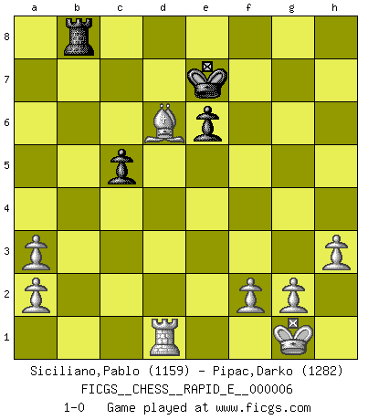 Last move : 1-0 2008 December 5 10:5:32 [Event "FICGS__CHESS__RAPID_E__000006"] [Site "FICGS"] [Date "2008.10.30"] [Round "1"] [White "Siciliano,Pablo"] [Black "Pipac,Darko"] [Result "1-0"] [WhiteElo "1159"] [BlackElo "1282"] 1.e4 e5 2.Nf3 Nc6 3.Bb5 a6 4.Bxc6 bxc6 5.d4 exd4 6.Qxd4 Qf6 7.e5 Qg6 8.O-O d6 9.Re1 Be6 10.exd6 Bxd6 11.Nc3 Qxc2 12.Qxg7 Bc5 13.Re2 Qg6 14.Qxh8 O-O-O 15.Qe5 Bd6 16.Qg5 Re8 17.Qxg6 hxg6 18.Bd2 Nf6 19.Rae1 Ng4 20.h3 Nf6 21.Nd4 Kd7 22.Nxe6 fxe6 23.Ne4 Nd5 24.Bc3 Rb8 25.Nf6+ Nxf6 26.Bxf6 g5 27.Rd1 a5 28.Bxg5 a4 29.Bf4 a3 30.bxa3 c5 31.Red2 Ke7 32.Rxd6 cxd6 33.Bxd6+ 1-0 Ruy Lopez : Exchange variation Kingside Castling by player White (move 8) Queenside Castling by player Black (move 14) Player White won this chess game. Follow this game move after move (download)What is the object of playing a gambit opening?... To acquire a reputation of being a dashing player at the cost of losing a game. (Siegbert Tarrasch) Im Spitzenschach von heute geht es nur um Vorbereitung, um tiefgründige, sorgfältige Eröffnungsvorbereitung. (Nigel Short) Los Peones son nacidos libres, y aún así, se encuentran por doquier encadenados. (Rick Kennedy) Tout change constamment, y compris dans le monde des Echecs. (Botvinnik) Faith : not wanting to know what is true. (Friedrich Nietzsche)