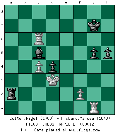 Last move : 1-0 2006 December 26 14:51:15 [Event "FICGS__CHESS__RAPID_B__000012"] [Site "FICGS"] [Date "2006.08.16"] [Round "1"] [White "Colter,Nigel"] [Black "Hrubaru,Mircea"] [Result "1-0"] [WhiteElo "1700"] [BlackElo "1649"] 1.e4 e5 2.Bc4 f5 3.d3 Nf6 4.Nf3 c6 5.Qe2 Be7 6.exf5 a5 7.a3 d5 8.Bb3 O-O 9.O-O Bxf5 10.Qxe5 Nfd7 11.Qe3 Nc5 12.Ba2 Ne6 13.d4 Nd7 14.c4 Nb6 15.c5 Nc4 16.Qc3 b5 17.b3 b4 18.axb4 axb4 19.Qxb4 Bxb1 20.Rxb1 Rxf3 21.bxc4 Rxa2 22.gxf3 Nxd4 23.Bb2 Nxf3+ 24.Kg2 Qf8 25.Qc3 Nh4+ 26.Kh1 d4 27.Qg3 Qf3+ 28.Qxf3 Nxf3 29.Rfd1 Bxc5 30.Kg2 Nh4+ 31.Kg3 Nf5+ 32.Kf4 g6 33.Ke4 Kg7 34.Kd3 Kf6 35.Rd2 Ra6 36.Bc1 Ng7 37.Rdb2 Ne6 38.Rb7 h5 39.h4 Ra2 40.Bg5+ Nxg5 41.hxg5+ Kxg5 42.Rf7 Kh6 43.Rg1 g5 44.Rf6+ Kg7 45.Rxc6 1-0 Bishop's Opening : Calabrese counter-gambit, Jaenisch variation Kingside Castling by player Black (move 8) Kingside Castling by player White (move 9) Player White won this chess game. Follow this game move after move (download)Morphy was probably the greatest genius of them all. (Bobby Fischer) Gewöhnliche Menschen denken nur daran, wie sie ihre Zeit verbringen. Ein intelligenter Mensch versucht, sie auszunutzen. (Arthur Schopenhauer) Ayuda a tus piezas para que ellas te puedan ayudar. (Paul Morphy) Le jeu d'échecs fait naître et fortifie en nous plusieurs qualités précieuses dans le cours de l'existence, telles que la prévoyance, la circonspection, la prudence, et la persévérance. (Benjamin Franklin - 1783, la morale des échecs) Strategy without tactics is the slowest route to victory. Tactics without strategy is the noise before defeat. (Sun Tzu)