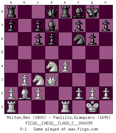 Last move : 0-1 2009 February 3 20:29:41 [Event "FICGS__CHESS__CLASS_C__000099"] [Site "FICGS"] [Date "2008.10.30"] [Round "1"] [White "Milton,Ben"] [Black "Paolillo,Giampiero"] [Result "0-1"] [WhiteElo "1800"] [BlackElo "1695"] 1.e4 e5 2.Nf3 Nc6 3.Bb5 d6 4.d4 Bd7 5.Nc3 Nf6 6.O-O Be7 7.Re1 exd4 8.Nxd4 O-O 9.Bxc6 bxc6 10.Qd3 Re8 11.b3 Bf8 12.Bb2 g6 0-1 This chess game has been lost on time (started : 2008.10.30 17:58:38) Comment by player 1 : Ben Milton : good luck Ruy Lopez : Old Steinitz defense Kingside Castling by player White (move 6) Kingside Castling by player Black (move 8) Player Black won this chess game. Follow this game move after move (download)When you absolutely don't know what to do anymore, it is time to panic. (John van der Wiel) Mutter, ich bin eben Ex-Weltmeister geworden. --beim nach Hause Kommen nach dem Verlust des WM-Titels an Mihail Botvinnik -- (Mikhail Nekhemyevich Tal) El jugador táctico debe saber que hacer cuando algo se debe de hacer. El estratégico debe saber que hacer cuando nada se debe de hacer. (Savielly Tartakover) Je ne crois pas en la psychologie, je crois aux bons coups. (Robert Fischer) We need strong personalities and only one world champion to attract sponsors. (Anatoly Karpov)