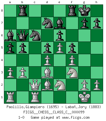 Last move : 1-0 2009 February 4 20:31:17 [Event "FICGS__CHESS__CLASS_C__000099"] [Site "FICGS"] [Date "2008.10.30"] [Round "1"] [White "Paolillo,Giampiero"] [Black "Labat,Jory"] [Result "1-0"] [WhiteElo "1695"] [BlackElo "1883"] 1.e4 e6 2.d4 d5 3.Nd2 Nf6 4.e5 Nfd7 5.Bd3 c5 6.c3 cxd4 7.cxd4 Nc6 8.Ne2 Be7 9.O-O O-O 10.f4 f5 11.a3 a5 12.Nf3 Rb8 13.Bd2 b5 14.b3 Qb6 15.Qc2 Ba6 16.Rfc1 1-0 French : Tarrasch, Closed variation Kingside Castling by player White (move 9) Kingside Castling by player Black (move 9) Player White won this chess game. Follow this game move after move (download)Openings teach you openings. Endgames teach you chess ! (Stephan Gerzadowicz) Matt entspricht nicht immer den Tatsachen. (Savielly Grigorievitsch Tartakower) Una victoria por una combinación errónea, aunque sea espectacular, me llena de horror artístico. (Wilhelm Steinitz) Si rien de grave n'est détecté lors de l'analyse d'une position, on joue alors le coup. Seconde règle de Blumenfeld. We cannot be sure of having something to live for unless we are willing to die for it. (Ernesto Che Guevara)