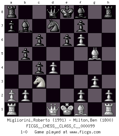 Last move : 1-0 2009 February 4 20:31:17 [Event "FICGS__CHESS__CLASS_C__000099"] [Site "FICGS"] [Date "2008.10.30"] [Round "1"] [White "Migliorini,Roberto"] [Black "Milton,Ben"] [Result "1-0"] [WhiteElo "1991"] [BlackElo "1800"] 1.d4 d5 2.c4 c6 3.Nf3 Nf6 4.Nc3 e6 5.Bg5 dxc4 6.e4 b5 7.e5 h6 8.Bh4 g5 9.Nxg5 hxg5 10.Bxg5 Nbd7 11.exf6 Bb7 12.g3 1-0 This chess game has been lost on time (started : 2008.10.30 17:58:38) QGD Slav : 4.Nc3 Player White won this chess game. Follow this game move after move (download)When you are lonely, when you feel yourself an alien in the world, play Chess. This will raise your spirits and be your counselor in war. (Aristotle) Alles was am Schachbrett zählt sind gute Züge. (Robert James Fischer) La partida mas dura de ganar es una partida ganada. (Emanuel Lasker) Plusieurs personnes se sont demandées comment Tal faisait pour gagner... En fait, c'est très simple ! Il met ses pièces au centre de l'échiquier et les sacrifie quelque part ! (David Bronstein) There are lots of people who mistake their imagination for their memory. (Josh Bilings)