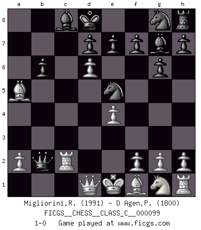Last move : 1-0 2008 December 11 10:12:15 [Event "FICGS__CHESS__CLASS_C__000099"] [Site "FICGS"] [Date "2008.10.30"] [Round "1"] [White "Migliorini,Roberto"] [Black "D Agen,Pierre"] [Result "1-0"] [WhiteElo "1991"] [BlackElo "1800"] 1.e4 c5 2.c3 Nc6 3.d4 cxd4 4.cxd4 g6 5.d5 Nb8 6.Nc3 Bg7 7.d6 Nc6 8.Nb5 Qa5+ 9.Bd2 Qb6 10.Nc7+ Kd8 11.Nxa8 Qxb2 12.Rc1 Ne5 13.Ba5+ b6 14.Nxb6 axb6 15.Rc2 1-0 Sicilian : Alapin's variation (2.c3) Player White won this chess game. Follow this game move after move (download)In complicated positions, Bobby Fischer hardly had to be afraid of anybody. (Paul Keres) Im Blitz ist es einfacher mit einer Figur weniger anzugreifen, als sich mit einer Mehrfigur zu verteidigen. (Mikhail Nekhemyevich Tal) El Ajedrez, como cualquier otra actividad creativa, puede existir solo a través de méritos combinados de aquellos que tienen talento creativo y de aquellos que tienen la habilidad de organizar un trabajo creativo. (Mikhail Botvinnik) Il n'y a pas eu de défaite parce que je ne crois pas que cet ordinateur ait jamais existé. IBM a triché en refusant d'imprimer les modes de recherche de la machine. C'est évident, pendant le match, des coups décisifs ont été joués par des êtres humains. Aujourd'hui, les meilleurs spécialistes en informatique ne peuvent toujours pas expliquer comment Deep-Blue a pu jouer contre la logique des ordinateurs. IBM a gagné une guerre de communication, mais ils sont incapables de prouver que l'ordinateur a gagné tout seul. (Garry Kasparov) How many people work in NATO Headquarters ? - About half of them. (Dirk Stikker, NATO general secretary)