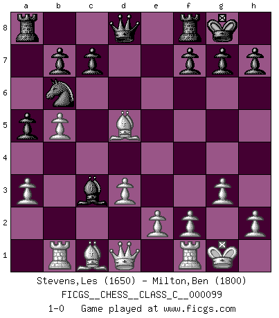 Last move : 1-0 2009 January 31 8:19:54 [Event "FICGS__CHESS__CLASS_C__000099"] [Site "FICGS"] [Date "2008.10.30"] [Round "1"] [White "Stevens,Les"] [Black "Milton,Ben"] [Result "1-0"] [WhiteElo "1650"] [BlackElo "1800"] 1.c4 e5 2.Nc3 Nf6 3.g3 d5 4.cxd5 Nxd5 5.Bg2 Nb6 6.Nf3 Nc6 7.O-O Be7 8.d3 O-O 9.a3 Be6 10.b4 a5 11.b5 Nd4 12.Nxe5 Bf6 13.Nf3 Nxf3+ 14.Bxf3 Bxc3 15.Rb1 Bd5 16.Bxd5 1-0 This chess game has been lost on time (started : 2008.10.30 17:58:38) English : Bremen, reverse Dragon Kingside Castling by player White (move 7) Kingside Castling by player Black (move 8) Player White won this chess game. Follow this game move after move (download)I played Chess with him and would have beaten him sometimes only he always took back his last move, and ran the game out differently. (Mark Twain) Schach verlangt totale Konzentration. (Robert James Fischer) Todo lo que importa ante el tablero de Ajedrez son buenas jugadas. (Bobby Fischer) Le thème de l'attaque double intervient d'une manière ou d'une autre dans l'immense majorité des combinaisons. (Youri Averbakh) It's not the will to win, but the will to prepare to win that makes the difference. (Bear Bryant)