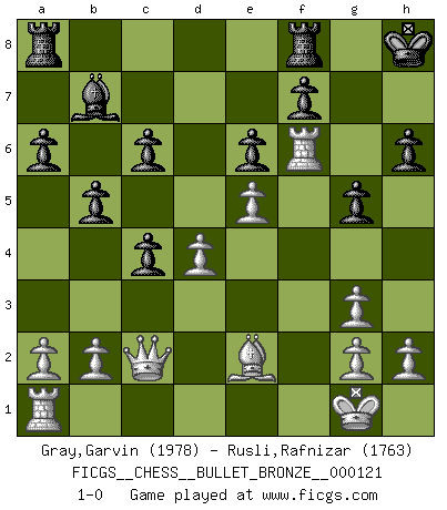 Last move : 1-0 2009 June 12 19:17:27 [Event "FICGS__CHESS__BULLET_BRONZE__000121"] [Site "FICGS"] [Date "2009.06.12"] [Round "1"] [White "Gray,Garvin"] [Black "Rusli,Rafnizar"] [Result "1-0"] [WhiteElo "1978"] [BlackElo "1763"] 1.Nf3 d5 2.d4 Nf6 3.c4 c6 4.Nc3 e6 5.Bg5 h6 6.Bh4 dxc4 7.e4 g5 8.Bg3 b5 9.Be2 Bb7 10.Ne5 Nbd7 11.O-O Bd6 12.Nxd7 Bxg3 13.Nxf6+ Qxf6 14.fxg3 Qe7 15.e5 a6 16.Ne4 O-O 17.Nf6+ Kh8 18.Qc2 Qxf6 19.Rxf6 1-0 Reti Opening Kingside Castling by player White (move 11) Kingside Castling by player Black (move 16) Player White won this chess game. Follow this game move after move (download)The only thing Chess players have in common is Chess. (Lodewijk Prins) Ich verachte Kasparow. (Viktor Kortschnoi) Bobby es la celebridad menos entendida y malinterpretada que camina el la faz de esta tierra. (Yasser Seirawan) Les sacrifices démontrent seulement que quelqu'un a gaffé. (Savielly Tartacover) Man with more than one clock never knows what time it is. (Chinese thought)