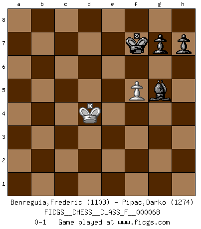 Last move : 0-1 2008 November 27 22:33:59 [Event "FICGS__CHESS__CLASS_F__000068"] [Site "FICGS"] [Date "2008.11.01"] [Round "1"] [White "Benreguia,Frederic"] [Black "Pipac,Darko"] [Result "0-1"] [WhiteElo "1103"] [BlackElo "1274"] 1.d4 f5 2.Nf3 Nf6 3.b4 Nc6 4.b5 Nb4 5.c3 Nbd5 6.e3 c6 7.c4 Nc7 8.a4 d5 9.Ne5 e6 10.bxc6 Bd6 11.cxb7 Bxb7 12.Nf3 Rb8 13.c5 Be7 14.Ne5 O-O 15.Ba3 Ba8 16.Nc3 Ng4 17.Nxg4 fxg4 18.Qxg4 Rb3 19.Ne2 Qb8 20.Nf4 Rb1+ 21.Rxb1 Qxb1+ 22.Qd1 Rb8 23.Bc1 Qb4+ 24.Bd2 Qb1 25.Be2 Rb2 26.O-O Qxd1 27.Rxd1 Bc6 28.Bg4 Bxa4 29.Bc1 Bxd1 30.Bxb2 Bxg4 31.c6 Bd6 32.h3 Bxf4 33.hxg4 Bg5 34.Ba3 Bd8 35.f4 Nb5 36.Bc5 a5 37.f5 exf5 38.gxf5 a4 39.g4 a3 40.Bxa3 Nxa3 41.g5 Nc4 42.Kf2 Na5 43.Kf3 Nxc6 44.Kf4 Kf7 45.e4 dxe4 46.Kxe4 Nxd4 47.Kxd4 Bxg5 0-1 Dutch Kingside Castling by player Black (move 14) Kingside Castling by player White (move 26) 10 pieces endgame at move 45 : White KPPP , Black KBNPPP WHITE : King + 3 Pawns BLACK : King + 1 Bishop 1 Knight 3 Pawns 9 pieces endgame at move 46 : White KPPP , Black KBNPP WHITE : King + 3 Pawns BLACK : King + 1 Bishop 1 Knight 2 Pawns 8 pieces endgame at move 46 : White KPP , Black KBNPP WHITE : King + 2 Pawns BLACK : King + 1 Bishop 1 Knight 2 Pawns 7 pieces endgame at move 47 : White KPP , Black KBPP WHITE : King + 2 Pawns BLACK : King + 1 Bishop 2 Pawns 6 pieces endgame at move 47 : White KP , Black KBPP WHITE : King + 1 Pawn BLACK : King + 1 Bishop 2 Pawns Player Black won this chess game. Follow this game move after move (download)All I want to do, ever, is just play Chess. (Bobby Fischer) Wie, soll nun auch die Opposition abgeschafft werden? Ja, es tut mir leid, Ihnen diesen Schmerz nicht ersparen zu können. (Aaron Nimzowitsch) El Ajedrez no es una pizca de inferior al violín, y tenemos un gran número de violinistas profesionales. (Mikhail Botvinnik) J'ai vu le vaincu d'Echecs jouer des années durant dans l'espoir de la fête de la victoire. Car tu es plus riche de ce qu'elle existe si même elle n'est point pour toi. Ainsi de la perle du fond des mers. (Antoine de Saint-Exupéry) If I had no sense of humor, I would long ago have committed suicide. (Mahatma Gandhi)