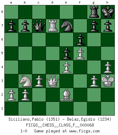 Last move : 1-0 2008 December 15 18:53:13 [Event "FICGS__CHESS__CLASS_F__000068"] [Site "FICGS"] [Date "2008.11.01"] [Round "1"] [White "Siciliano,Pablo"] [Black "Belaz,Egidio"] [Result "1-0"] [WhiteElo "1351"] [BlackElo "1234"] 1.e4 c5 2.Nf3 d6 3.d4 cxd4 4.Nxd4 Nf6 5.Nc3 e5 6.Nb3 Be7 7.Bg5 O-O 8.Bxf6 Bxf6 9.Nd5 Nc6 10.c3 Be6 11.Be2 Bxd5 12.Qxd5 Bh4 13.O-O Kh8 14.Rad1 Be7 15.f4 Bf6 16.Qxd6 Qb6+ 17.Qc5 Qc7 18.f5 Be7 19.Qe3 Rfd8 20.Qh3 Bg5 21.Qg4 Rxd1 22.Rxd1 f6 23.h4 Qb6+ 24.Kh2 Bf4+ 25.Kh3 Qf2 26.Qf3 Qb6 27.g3 Be3 28.Rd3 Bc5 29.Rd5 Rd8 30.Rxc5 Qc7 31.Rd5 Rg8 32.Qd3 Ne7 33.Rd7 1-0 Sicilian Kingside Castling by player Black (move 7) Kingside Castling by player White (move 13) Player White won this chess game. Follow this game move after move (download)A man that will take back a move at Chess will pick a pocket. (Richard Fenton) Computer sind die einzigen Gegner, die nicht immer eine Ausrede auf Lager haben, wenn sie gegen mich verlieren. (Robert James Fischer) Fischer es una tragedia del Ajedrez Americano a la par con Morphy y Pillsbury. (Mig Greengard) Les échecs sont un jeu terrible. Si vous n'avez pas le centre, votre adversaire a une position plus libre. Par contre, si vous avez le centre, alors vous avez vraiment quelque chose pour laquelle vous inquiéter ! (Siegbert Tarrasch) Panic is a sudden desertion of us, an a going over to the enemy of our imagination. (Christian Nevell Bovee)