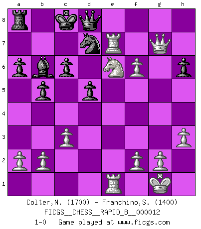 Last move : 1-0 2006 September 21 1:34:21 [Event "FICGS__CHESS__RAPID_B__000012"] [Site "FICGS"] [Date "2006.08.16"] [Round "1"] [White "Colter,Nigel"] [Black "Franchino,Sebastian"] [Result "1-0"] [WhiteElo "1700"] [BlackElo "1400"] 1.e4 e5 2.Bc4 Nf6 3.d3 Nc6 4.Nf3 Bc5 5.O-O d6 6.c3 Bg4 7.Nbd2 O-O 8.Re1 a6 9.Nf1 b5 10.Bb3 Na5 11.Bc2 Nb7 12.h3 Bxf3 13.Qxf3 c6 14.Bg5 Re8 15.Ng3 d5 16.d4 exd4 17.e5 d3 18.Bxd3 h6 19.Bxf6 gxf6 20.Qg4+ Kf8 21.Nh5 Ke7 22.exf6+ Kd6 23.Qg3+ Kd7 24.Bf5+ Re6 25.Qg7 Kd6 26.Bxe6 fxe6 27.Re2 Bb6 28.Rae1 Nc5 29.Nf4 e5 30.Rxe5 Nd7 31.Re6+ Kc7 32.Re7 Kc8 33.Ne6 1-0 Bishop's Opening : Berlin defense Kingside Castling by player White (move 5) Kingside Castling by player Black (move 7) Player White won this chess game. Follow this game move after move (download)The hardest game to win is a won game. (Emanuel Lasker) Ich organisiere ein großes Turnier, was mich etwa 120000 Dollar kostet. Ich denke, das ist das erste Mal in der Schachgeschichte, daß ein Schachgroßmeister auch als Mäzen auftritt. (Miguel Najdorf) ¡Examina movidas que hagan daño! Un buen ojo for movidas desvastantes es mucho mas importante que el conocimiento de principios estratégicos. (Purdy) Même si vous avez un bon coup à faire, regardez toujours s'il n'y en a pas un qui lui soit préférable. (Pedro Damiano) God is an atheist. (Unknown)