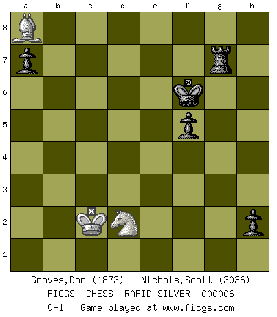 Last move : 0-1 2008 November 21 6:29:25 [Event "FICGS__CHESS__RAPID_SILVER__000006"] [Site "FICGS"] [Date "2008.11.01"] [Round "2"] [White "Groves,Don"] [Black "Nichols,Scott"] [Result "0-1"] [WhiteElo "1872"] [BlackElo "2036"] 1.e4 d6 2.d4 Nf6 3.Nd2 g6 4.Ngf3 Bg7 5.Bc4 O-O 6.c3 c6 7.O-O Nbd7 8.Bd3 Qc7 9.Re1 e5 10.a4 b6 11.Nc4 Re8 12.Bg5 h6 13.Bd2 exd4 14.cxd4 Ba6 15.Qc2 d5 16.exd5 Nxd5 17.b4 c5 18.Qb3 cxb4 19.Nxb6 Qxb6 20.Bxa6 Bxd4 21.Rxe8+ Rxe8 22.Qxd5 Bxa1 23.Qxd7 Rd8 24.a5 Qd6 25.Qxd6 Rxd6 26.Bc4 Bc3 27.Bxc3 bxc3 28.Bb3 Ra6 29.Kf1 Rxa5 30.Ke2 Kg7 31.Nd4 Ra1 32.Bd5 Rc1 33.Kd3 c2 34.Nxc2 Rd1+ 35.Kc4 Rd2 36.Nb4 Rxf2 37.Nc6 Ra2 38.Kb3 Ra6 39.Nb4 Ra5 40.Bf3 f5 41.Nc6 Ra1 42.Kb2 Ra6 43.Kb3 Kf6 44.Nb4 Ra1 45.Nc6 h5 46.h3 h4 47.Nd4 g5 48.Nc2 Rb1+ 49.Ka3 Ke5 50.Ka4 Rg1 51.Bb7 g4 52.Kb5 gxh3 53.gxh3 Rg3 54.Kc4 Rxh3 55.Nd4 Rg3 56.Nf3+ Kf6 57.Kd3 h3 58.Kc2 Rg2+ 59.Nd2 Rg7 60.Ba8 h2 0-1 King's pawn Opening Kingside Castling by player Black (move 5) Kingside Castling by player White (move 7) 10 pieces endgame at move 52 : White KBNP , Black KRPPPP WHITE : King + 1 Bishop 1 Knight 1 Pawn BLACK : King + 1 Rook 4 Pawns 9 pieces endgame at move 53 : White KBNP , Black KRPPP WHITE : King + 1 Bishop 1 Knight 1 Pawn BLACK : King + 1 Rook 3 Pawns 8 pieces endgame at move 54 : White KBN , Black KRPPP WHITE : King + 1 Bishop 1 Knight BLACK : King + 1 Rook 3 Pawns Player Black won this chess game. Follow this game move after move (download)When you don't know what to do, wait for your opponent to get an idea - it's sure to be wrong. (Tarrasch) Es ist peinlich, dass ich nie Weltmeister wurde. Es wäre leicht, Leonid Breschnjew als Ursache vorzuschieben, dessen Apparat den Vorzeigekommunisten Anatoli Karpow in allem unterstützte. Aber Garri Kasparow zum Beispiel, der ebenfalls von den Sowjets unerwünscht war, hat trotz der Widerstände den WM-Titel erobert. (Viktor Kortschnoi) La última cosa en que Fischer estaba interesado era en tonterías, siempre y cuando el Ajedrez estuviera involucrado. (Elie Agur) Un millionnaire : 'Monsieur Steinitz ! Vous ne participez aux tournois que pour l'argent, alors que moi je n'y viens que pour l'honneur.' Steinitz : 'Chacun joue pour ce qu'il n'a pas'... The only sure thing about luck is that it will change. (Wilson Mizner)