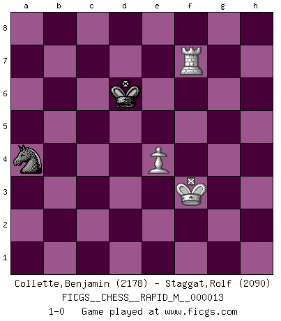 Last move : 1-0 2009 January 30 18:39:48 [Event "FICGS__CHESS__RAPID_M__000013"] [Site "FICGS"] [Date "2008.11.02"] [Round "1"] [White "Collette,Benjamin"] [Black "Staggat,Rolf"] [Result "1-0"] [WhiteElo "2178"] [BlackElo "2090"] 1.d4 Nf6 2.c4 e6 3.Nc3 Bb4 4.g3 c5 5.Nf3 cxd4 6.Nxd4 Ne4 7.Qd3 Qa5 8.Nb3 Nxc3 9.Bd2 Ne4 10.Qxe4 Bxd2+ 11.Nxd2 Nc6 12.Bg2 O-O 13.Qe3 d5 14.O-O d4 15.Qd3 e5 16.a3 Bf5 17.Qxf5 Qxd2 18.Qd3 Qxd3 19.exd3 g5 20.b4 Rab8 21.Rae1 Rfe8 22.f4 exf4 23.gxf4 g4 24.Rxe8+ Rxe8 25.Be4 Kg7 26.h3 gxh3 27.Rf3 Re6 28.Rxh3 h6 29.Rh5 Kf8 30.b5 Na5 31.c5 Rf6 32.Kg2 Rxf4 33.c6 bxc6 34.bxc6 Rxe4 35.dxe4 Nxc6 36.Rxh6 Ne5 37.Ra6 Ke7 38.Rxa7+ Kd6 39.a4 d3 40.Kf2 Nc4 41.Rxf7 d2 42.Ke2 d1Q+ 43.Kxd1 Nb2+ 44.Ke2 Nxa4 45.Kf3 1-0 Nimzo-Indian : Romanishin-Kasparov (Steiner) system Kingside Castling by player Black (move 12) Kingside Castling by player White (move 14) 10 pieces endgame at move 35 : White KRPP , Black KNPPPP WHITE : King + 1 Rook 2 Pawns BLACK : King + 1 Knight 4 Pawns 9 pieces endgame at move 36 : White KRPP , Black KNPPP WHITE : King + 1 Rook 2 Pawns BLACK : King + 1 Knight 3 Pawns 8 pieces endgame at move 38 : White KRPP , Black KNPP WHITE : King + 1 Rook 2 Pawns BLACK : King + 1 Knight 2 Pawns 7 pieces endgame at move 41 : White KRPP , Black KNP WHITE : King + 1 Rook 2 Pawns BLACK : King + 1 Knight 1 Pawn Promotion Queen by player Black (move 42) 6 pieces endgame at move 43 : White KRPP , Black KN WHITE : King + 1 Rook 2 Pawns BLACK : King + 1 Knight 5 pieces endgame at move 44 : White KRP , Black KN WHITE : King + 1 Rook 1 Pawn BLACK : King + 1 Knight Player White won this chess game. Follow this game move after move (download)A player surprised is half beaten. (Proverb) Jeder Schachmeister war einmal ein Anfänger. (Irving Chernev) El poder defensivo de una pieza clavada, solamente es imaginario. (Aaron Nimzovich) J'ai vu le vaincu d'Echecs jouer des années durant dans l'espoir de la fête de la victoire. Car tu es plus riche de ce qu'elle existe si même elle n'est point pour toi. Ainsi de la perle du fond des mers. (Antoine de Saint-Exupéry) The absolute truth is the thing that makes people laugh. (Carl Reiner)