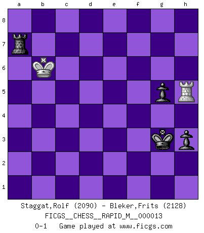 Last move : 0-1 2009 April 3 16:55:31 [Event "FICGS__CHESS__RAPID_M__000013"] [Site "FICGS"] [Date "2008.11.02"] [Round "1"] [White "Staggat,Rolf"] [Black "Bleker,Frits"] [Result "0-1"] [WhiteElo "2090"] [BlackElo "2128"] 1.e4 c5 2.Nf3 d6 3.d4 cxd4 4.Nxd4 Nf6 5.Nc3 a6 6.Be3 e5 7.Nb3 Be7 8.f3 Be6 9.Qd2 O-O 10.O-O-O Nbd7 11.g4 b5 12.g5 Nh5 13.Nd5 Bxd5 14.exd5 f6 15.gxf6 Bxf6 16.Na5 Nf4 17.Nc6 Qc7 18.c4 bxc4 19.Bxc4 Nb6 20.Bb3 a5 21.a4 Bd8 22.Kb1 Qf7 23.h4 Nd7 24.Qf2 Kh8 25.Ka1 Ra6 26.Nxd8 Rxd8 27.Bc4 R6a8 28.Qd2 Rac8 29.Bb5 Nc5 30.Ka2 Rf8 31.Rhg1 Qf5 32.Rg5 Qh3 33.Rc1 Qxh4 34.Rcg1 g6 35.R5g4 Qe7 36.Rh1 Kg8 37.Rc1 Kg7 38.Bxf4 exf4 39.Rxf4 Rxf4 40.Qxf4 h5 41.Qd2 Qf7 42.Rc3 Rf8 43.Re3 Qf4 44.Re7+ Kh6 45.Qxa5 Qd4 46.Qc7 Rf6 47.Rh7+ Kg5 48.Qe7 Nd3 49.f4+ Nxf4 50.Qe1 Nxd5 51.Qg3+ Qg4 52.Qh2 Rf4 53.Qd2 Nb4+ 54.Ka3 Qg1 55.Bc4 d5 56.Kxb4 dxc4 57.Kb5 Qf1 58.Kb6 Qf2+ 59.Qxf2 Rxf2 60.Kc5 Rxb2 61.Kxc4 h4 62.a5 Ra2 63.Kb5 Kg4 64.a6 g5 65.a7 h3 66.Kb6 Kg3 67.Rh5 Rxa7 0-1 Sicilian : Najdorf, Byrne (English) attack Kingside Castling by player Black (move 9) Queenside Castling by player White (move 10) 10 pieces endgame at move 59 : White KQRPP , Black KRPPP WHITE : King + 1 Queen 1 Rook 2 Pawns BLACK : King + 1 Rook 3 Pawns 9 pieces endgame at move 59 : White KRPP , Black KRPPP WHITE : King + 1 Rook 2 Pawns BLACK : King + 1 Rook 3 Pawns 8 pieces endgame at move 60 : White KRP , Black KRPPP WHITE : King + 1 Rook 1 Pawn BLACK : King + 1 Rook 3 Pawns 7 pieces endgame at move 61 : White KRP , Black KRPP WHITE : King + 1 Rook 1 Pawn BLACK : King + 1 Rook 2 Pawns 6 pieces endgame at move 67 : White KR , Black KRPP WHITE : King + 1 Rook BLACK : King + 1 Rook 2 Pawns Player Black won this chess game. Follow this game move after move (download)The chessboard is the world, the pieces are the phenomena of the Universe, the rules of the game are what we call the laws of Nature and the player on the other side is hidden from us. (Thomas Huxley) Wenn Dein Gegner dir ein Remis anbietet, versuch herauszufinden, weshalb er glaubt schlechter zu stehen. (Nigel Short) Tu eres para mi la Reina en d8 y yo soy el Peón en d7!!. (GM Eduard Gufeld) A ce moment-là, je menaçais de comprendre la position ! (Clément L'Heureux) Who needs drugs and alcohol if he can play Big Chess at FICGS ? (Heinz-Georg Lehnhoff)