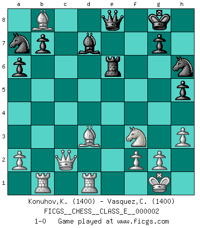 Last move : 1-0 2006 June 2 1:33:43 [Event "FICGS__CHESS__CLASS_E__000002"] [Site "FICGS"] [Date "2006.04.15"] [Round "1"] [White "Konuhov,Konstantin"] [Black "Vasquez,Carlos"] [Result "1-0"] [WhiteElo "1400"] [BlackElo "1400"] 1.d4 d5 2.c4 Nf6 3.cxd5 Qxd5 4.Nc3 Qd8 5.Nf3 e6 6.e4 h6 7.Bf4 Bb4 8.Qa4+ Nc6 9.Bd3 Bxc3+ 10.bxc3 O-O 11.O-O a6 12.Rfd1 Bd7 13.Qc2 Nh5 14.Be3 Nf6 15.Rab1 Rb8 16.c4 Ng4 17.Bf4 Re8 18.e5 h5 19.h3 Nh6 20.d5 exd5 21.cxd5 Na7 22.e6 fxe6 23.dxe6 Rxe6 24.Bxc7 Qe8 25.Bxb8 1-0 QGD : Marshall defense Kingside Castling by player Black (move 10) Kingside Castling by player White (move 11) Player White won this chess game. Follow this game move after move (download)Kasparov : J'adoube , Ivanchuk : S'il vous plaît ! (Garry Kasparov & Vassily Ivanchuk, Linares 1997) Die meiste Zeit treffe ich auf Gegner, die meine Enkel sein könnten. Ich bin da, um ihnen zu zeigen, dass sie von mir noch einiges lernen können. (Viktor Kortschnoi) Un mal plan es mejor que no tener ningún plan. (Frank Marshall) Les échecs c'est le défi de l'alpiniste, toujours plus haut, prêt à tout pour monter à l'assaut du Roi ennemi. Les échecs, c'est de la musique en mouvement, un ballet majestueux pour les yeux. C'est de la poésie composée par les fantômes du passé qui au même titre que Rimbaud ou Verlaine méritent notre admiration. Les échecs, c'est de la peinture ou le moindre mouvement modifie le tableau pour en faire un Picasso ou un Van Gogh. Les échecs, c'est tout et rien, c'est la vie et la mort. Jjulie33 sur le forum de France-Echecs. I have opinions of my own - strong opinions - but I don't always agree with them. (George Bush)