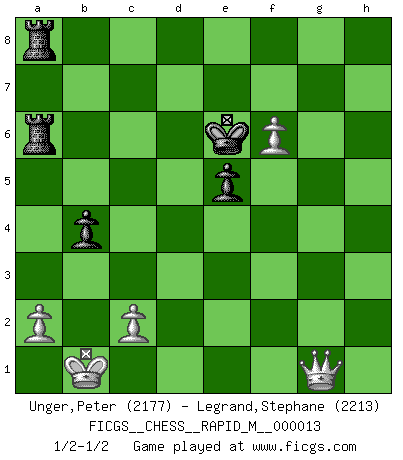 Last move : 1/2-1/2 2008 December 16 12:9:9 [Event "FICGS__CHESS__RAPID_M__000013"] [Site "FICGS"] [Date "2008.11.02"] [Round "1"] [White "Unger,Peter"] [Black "Legrand,Stephane"] [Result "1/2-1/2"] [WhiteElo "2177"] [BlackElo "2213"] 1.e4 c5 2.Nf3 d6 3.d4 cxd4 4.Nxd4 Nf6 5.Nc3 Nc6 6.Bg5 e6 7.Qd2 a6 8.O-O-O Bd7 9.f4 b5 10.Bxf6 gxf6 11.Kb1 Qb6 12.Nxc6 Bxc6 13.f5 Qc5 14.Bd3 b4 15.Ne2 e5 16.Ng3 Ke7 17.Nh5 Rg8 18.Rhg1 a5 19.g4 a4 20.h4 a3 21.g5 fxg5 22.hxg5 Qd4 23.Qc1 axb2 24.Qxb2 Qc5 25.Qc1 Kd8 26.Nf6 Rh8 27.Rh1 Be7 28.Rxh7 Bxf6 29.Rxf7 Bd5 30.exd5 Qxd5 31.Ba6 Qxf7 32.Rxd6+ Ke7 33.Re6+ Qxe6 34.fxe6 Rxa6 35.gxf6+ Kxe6 36.Qg1 Rha8 1/2-1/2 Sicilian : Richter-Rauzer, Rauzer attack, 7...a6 Queenside Castling by player White (move 8) 10 pieces endgame at move 35 : White KQPPP , Black KRRPP WHITE : King + 1 Queen 3 Pawns BLACK : King + 2 Rooks 2 Pawns This chess game ended in a draw. Follow this game move after move (download)Chess problems demand from the composer the same virtues that characterize all worthwhile art: originality, invention, conciseness, harmony, complexity, and splendid insincerity. (Vladimir Nabokov) Der Partner hat auch seine Existenzberechtigung. (Savielly Grigorievitsch Tartakower) El Ajedrez es un mar en el cual un mosquito puede beber y un elefante puede bañarse. (Refrán Hindú) Ne tendez aucun piège pour le plaisir ! Ne jouez rien dans l'espoir que l'adversaire réagisse de façon stupide ! Prenez toujours pour acquis que l'adversaire va trouver le meilleur coup ! Ne jouez jamais de coup dans l'espoir que l'adversaire ne voie pas la menace ! Chacun de vos coups doit améliorer la position d'une façon ou d'une autre. If you are going through hell, keep going. (Winston Churchill)