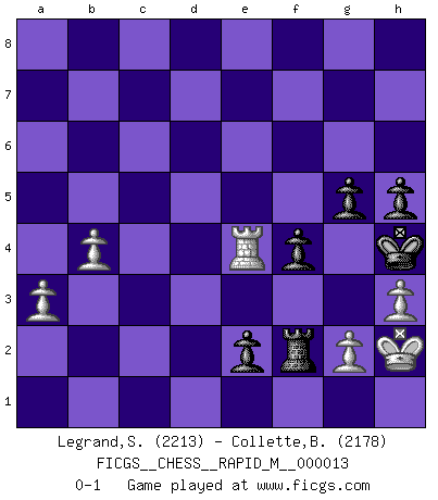 Last move : 0-1 2009 April 3 22:48:35 [Event "FICGS__CHESS__RAPID_M__000013"] [Site "FICGS"] [Date "2008.11.02"] [Round "1"] [White "Legrand,Stephane"] [Black "Collette,Benjamin"] [Result "0-1"] [WhiteElo "2213"] [BlackElo "2178"] 1.e4 e6 2.d4 d5 3.Nd2 c5 4.Ngf3 cxd4 5.Nxd4 Nf6 6.exd5 Qxd5 7.N2f3 Bd7 8.Be2 Nc6 9.O-O Nxd4 10.Nxd4 Bc5 11.Be3 Qe5 12.c3 O-O 13.Bd3 Qc7 14.Bg5 Nd5 15.Qh5 f5 16.Qh4 h6 17.Bd2 Rf7 18.Rae1 Re8 19.Nf3 Bd6 20.Re2 e5 21.Bc4 Be6 22.Bb3 Nb6 23.Bxe6 Rxe6 24.b3 Ref6 25.c4 e4 26.Nd4 a6 27.Ba5 Qc5 28.Bc3 Nd5 29.cxd5 Qxc3 30.Rd1 Qa5 31.Ne6 Rd7 32.Rc2 Bf8 33.Nxf8 Rxd5 34.Rdc1 Qd8 35.h3 Rxf8 36.Qg3 Rd1+ 37.Kh2 Rd3 38.Qe5 Qf6 39.Qf4 g5 40.Qc7 Rf7 41.Qc8+ Rd8 42.Qc4 Kg7 43.Kg1 Kg6 44.Re1 Rd4 45.Qc8 Qd8 46.Qe6+ Rf6 47.Qe5 Rd5 48.Qb2 Rfd6 49.b4 Rd1 50.Rc1 R1d2 51.Rc2 R2d3 52.Qe5 Rd1 53.Rc1 R1d5 54.Qb2 Qf6 55.Qb3 Qf7 56.a3 Rd3 57.Qb2 Qf6 58.Qa2 Qe6 59.Qb2 Rd2 60.Rc2 Qd5 61.Qc3 Rxc2 62.Qxc2 Qd2 63.Qxd2 Rxd2 64.Rc1 Ra2 65.Rc7 Ra1+ 66.Kh2 Rf1 67.Rxb7 Rxf2 68.Rb6+ Kh5 69.Kg1 e3 70.Rxa6 f4 71.Re6 Kh4 72.Kh2 h5 73.Re4 e2 0-1 French : Tarrasch, Open variation Kingside Castling by player White (move 9) Kingside Castling by player Black (move 12) Player Black won this chess game. Follow this game move after move (download)All my games are real. (Bobby Fischer) Computer sind die einzigen Gegner, die nicht immer eine Ausrede auf Lager haben, wenn sie gegen mich verlieren. (Robert James Fischer) La última cosa en que Fischer estaba interesado era en tonterías, siempre y cuando el Ajedrez estuviera involucrado. (Elie Agur) J'ai toujours senti une vague pitié pour l'homme qui ne connaît rien aux échecs, tout comme j'en aurais pour un homme ignorant de l'amour. Les Echecs, comme la musique ou comme l'amour, ont le pouvoir de rendre heureux. (Siegbert Tarrasch) The leaves of memory seemed to make a mournful rustling in the dark. (Henry Wadsworth Longfellow)