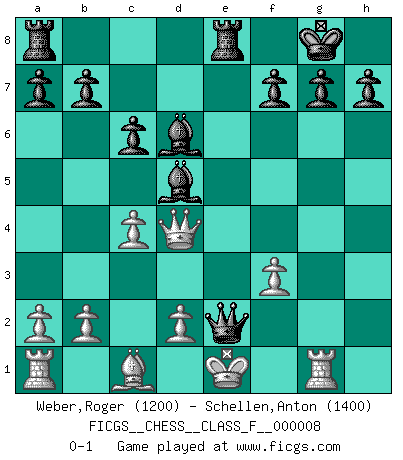Last move : 0-1 2006 October 1 13:32:21 [Event "FICGS__CHESS__CLASS_F__000008"] [Site "FICGS"] [Date "2006.08.18"] [Round "1"] [White "Weber,Roger"] [Black "Schellen,Anton"] [Result "0-1"] [WhiteElo "1200"] [BlackElo "1400"] 1.e4 e5 2.Nf3 Nc6 3.Nc3 Nf6 4.Bb5 Bb4 5.Nd5 Nxd5 6.exd5 e4 7.Qe2 O-O 8.dxc6 dxc6 9.Ng1 cxb5 10.Qxb5 Bd6 11.Ne2 c6 12.Qc4 Be6 13.Qxe4 Bd5 14.Qd3 Qg5 15.f3 Qxg2 16.Rg1 Qxh2 17.c4 Rfe8 18.Qd4 Qxe2+ 0-1 Four knights : double Ruy Lopez Kingside Castling by player Black (move 7) Player Black won this chess game. Follow this game move after move (download)In the perfect Chess combination as in a first-rate short story, the whole plot and counter-plot should lead up to a striking finale, the interest not being allayed until the very last moment. (Yates and Winter) Ich hatte meine größten Erfolge, als ich 47 Jahre alt war. Kasparow war noch nicht mal 42 und hat das Schach schon im Stich gelassen. (Viktor Kortschnoi) Bobby es la celebridad menos entendida y malinterpretada que camina el la faz de esta tierra. (Yasser Seirawan) Les ravages du H expliquent la différence de niveau entre Tal et Thal [Abergel]. God, you are such an idiot. - Actually, I thought I was more of a jerk. (Gregory House to Stacy Warner, House M.D.)