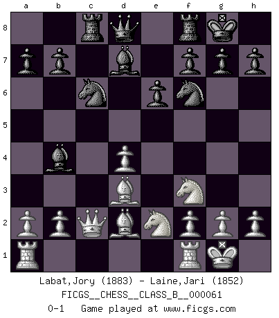 Last move : 0-1 2009 March 1 9:55:23 [Event "FICGS__CHESS__CLASS_B__000061"] [Site "FICGS"] [Date "2008.11.03"] [Round "1"] [White "Labat,Jory"] [Black "Laine,Jari"] [Result "0-1"] [WhiteElo "1883"] [BlackElo "1852"] 1.d4 Nf6 2.c4 e6 3.Nc3 Bb4 4.Qc2 O-O 5.Nf3 c5 6.e3 d5 7.cxd5 cxd4 8.exd4 Nxd5 9.Bd2 Nc6 10.Bd3 Nf6 11.Ne2 Bd7 12.O-O Rc8 0-1 This chess game has been lost on time (started : 2008.11.03 14:10:55) Nimzo-Indian : Classical variation Kingside Castling by player Black (move 4) Kingside Castling by player White (move 12) Player Black won this chess game. Follow this game move after move (download)I look one move ahead... the best ! (Siegbert Tarrasch) Im Leben werden Partien nie so unstrittig gewonnen wie im Spiel (Emanuel Lasker) A través de las casillas del tablero, los Indios explican el movimiento del tiempo y la edad, las influencias mas altas que controlan el mundo y los lazos que vinculan al Ajedrez con el alma humana. (Al-Masudi) L'action d'une oeuvre littéraire se déroule sur un champ de bataille. Les masques et les types du drame moderne correspondent aux pièces du jeu d'échecs. L'intrigue correspond aux coups et aux gambits, c'est à dire aux techniques du jeu telles qu'utilisées et interprétées par les joueurs. Les tactiques et les péripéties [mouvements] correspondent aux coups exécutés par l'adversaire. (Viktor Shklovsky) The hypothalamus is one of the most important parts of the brain, involved in many kinds of motivation, among other functions. The hypothalamus controls the 'Four Fs: Fighting, Fleeing, Feeding and Mating. (Unknown author)