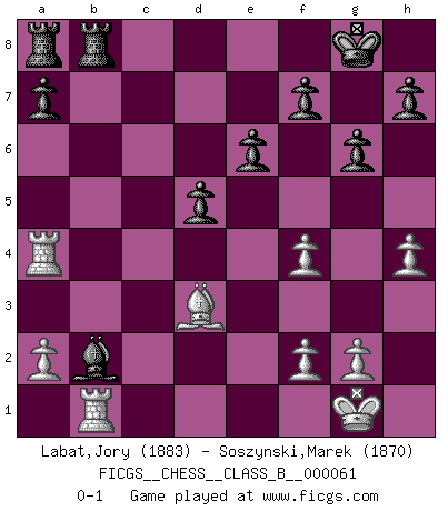 Last move : 0-1 2009 February 5 8:32:37 [Event "FICGS__CHESS__CLASS_B__000061"] [Site "FICGS"] [Date "2008.11.03"] [Round "1"] [White "Labat,Jory"] [Black "Soszynski,Marek"] [Result "0-1"] [WhiteElo "1883"] [BlackElo "1870"] 1.d4 c6 2.c4 d5 3.Nf3 g6 4.Nc3 Bg7 5.cxd5 cxd5 6.Bf4 Nf6 7.e3 O-O 8.Be2 Nc6 9.O-O Nh5 10.Rc1 Nxf4 11.exf4 Qa5 12.Ne5 Be6 13.h4 Qb6 14.Na4 Qxd4 15.Nxc6 bxc6 16.Qxd4 Bxd4 17.Rxc6 Bd7 18.Ra6 Bxa4 19.Rxa4 Bxb2 20.Rb1 Rfb8 21.Bd3 e6 0-1 Queen's pawn Kingside Castling by player Black (move 7) Kingside Castling by player White (move 9) Player Black won this chess game. Follow this game move after move (download)All Chess players should have a hobby. (Savielly Tartakower) Schach ist Leben. (Robert James Fischer) La única cosa que los jugadores de Ajedrez tienen en común, es el Ajedrez. (Lodewijk Prins) Les erreurs sont comme les malheurs, elles n'arrivent jamais seules. (Siegbert Tarrasch) Political correctness is subjecting us to gross incompetence. (Johann Piek)