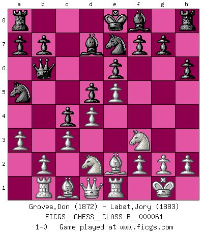 Last move : 1-0 2009 January 28 19:57:47 [Event "FICGS__CHESS__CLASS_B__000061"] [Site "FICGS"] [Date "2008.11.03"] [Round "1"] [White "Groves,Don"] [Black "Labat,Jory"] [Result "1-0"] [WhiteElo "1872"] [BlackElo "1883"] 1.e4 e6 2.d4 d5 3.e5 c5 4.c3 Bd7 5.Nf3 Nc6 6.Be2 Qb6 7.a3 c4 8.O-O Na5 9.Nbd2 Ne7 10.Rb1 h6 11.Re1 1-0 This chess game has been lost on time (started : 2008.11.03 14:10:55) French : Advance variation Kingside Castling by player White (move 8) Player White won this chess game. Follow this game move after move (download)There must have been a time when men were demigods, or they could not have invented Chess. (Gustav Schenk) Habe Mut, dich deines eigenen Verstandes zu bedienen. (Immanuel Kant) El Ajedrez, como cualquier actividad creativa, solo puede existir a través del esfuerzo combinado de aquellos que tienen talento creativo y de aquellos que poseen la habilidad de organizar su trabajo creativo. (Mikhail Botvinnik) Que feriez-vous si vous étiez en train de jouer aux échecs et que la fin du monde arrive ? Je continuerais à jouer. (Saint Borromée) CHESS, n. f. [echecs, Fr.] A nice and abstruse game, in which two sets of puppets are moved in opposition to each other. (Dr Samuel Johnson, A Dictionary Of The English Language, 1755)