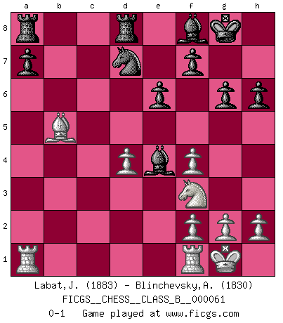 Last move : 0-1 2009 February 4 20:31:17 [Event "FICGS__CHESS__CLASS_B__000061"] [Site "FICGS"] [Date "2008.11.03"] [Round "1"] [White "Labat,Jory"] [Black "Blinchevsky,Alexander"] [Result "0-1"] [WhiteElo "1883"] [BlackElo "1830"] 1.d4 d5 2.c4 e6 3.Nc3 Nf6 4.Nf3 c6 5.Bf4 dxc4 6.a4 Bb4 7.Qc2 Qa5 8.Nd2 b5 9.e3 Nd5 10.Rc1 Nxf4 11.exf4 O-O 12.Be2 Bb7 13.O-O Rd8 14.Nf3 Nd7 15.Ng5 g6 16.axb5 cxb5 17.Nce4 Qb6 18.b3 h6 19.Nf3 Ba3 20.Ra1 cxb3 21.Qxb3 Bf8 22.Qxb5 Qxb5 23.Bxb5 Bxe4 0-1 QGD Semi-Slav Kingside Castling by player Black (move 11) Kingside Castling by player White (move 13) Player Black won this chess game. Follow this game move after move (download)In complicated positions, Bobby Fischer hardly had to be afraid of anybody. (Paul Keres) Viele Opfer benötigen überhaupt keine konkrete Berechnung. Es genügt sich die entstehende Position kurz vorzustellen, um uns davon zu überzeugen, dass das Opfer korrekt ist. (Mikhail Nekhemyevich Tal) Los finales de Peón son del Ajedrez lo que el cesped es del Golf. (Cecil Purdy) Les écrivains ont utilisé les échecs pour analyser les côtés extrêmes de la nature humaine. Dans ce cadre, les échecs offrent un champ d'expérimentation idéal. Mais on pourrait faire la même chose avec la peinture. Et là, en vous référant à Van Gogh, vous ne tirerez pas de conclusion définitive sur les peintres. (Gary Kasparov) A shortcut is the longest distance between two points. (Don Groves)