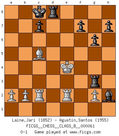 Last move : 0-1 2009 February 8 13:55:36 [Event "FICGS__CHESS__CLASS_B__000061"] [Site "FICGS"] [Date "2008.11.03"] [Round "1"] [White "Laine,Jari"] [Black "Agustin,Santos"] [Result "0-1"] [WhiteElo "1852"] [BlackElo "1955"] 1.e4 e5 2.Nf3 Nf6 3.Nxe5 d6 4.Nf3 Nxe4 5.d4 d5 6.Bd3 Nc6 7.O-O Be7 8.Re1 Bg4 9.c4 Nf6 10.cxd5 Bxf3 11.Qxf3 Qxd5 12.Qxd5 Nxd5 13.Nc3 O-O-O 14.Nxd5 Rxd5 15.Be4 Rxd4 16.Bxc6 bxc6 17.Be3 Rd5 18.Bxa7 Bf6 19.Re2 c5 20.Rc1 Bg5 21.f4 Bxf4 22.Rxc5 Rd1+ 23.Kf2 Bxh2 24.Kf3 Rd3+ 25.Ke4 Rg3 26.R5c2 Rd8 27.Bc5 g6 0-1 Petrov : Classical attack Kingside Castling by player White (move 7) Queenside Castling by player Black (move 13) Player Black won this chess game. Follow this game move after move (download)Chess mastery essentially consists of analyzing Chess positions accurately. (Mikhail Botvinnik) Ich war zu klein für die Schach-Schülermannschaft! (Woody Allen) Cuando veas una buena jugada, trata de encontrar otra mejor. (Emanuel Lasker) Les échecs sont utiles à l'exercice de la faculté de penser et à celle de l'imagination. Car nous devons posséder une méthode élaborée pour atteindre des buts partout où nous devons conduire notre raison. (Leibnitz) The arrogant army will lose certainly the battle. (Chinese proverb)
