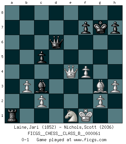Last move : 0-1 2009 April 7 16:33:1 [Event "FICGS__CHESS__CLASS_B__000061"] [Site "FICGS"] [Date "2008.11.03"] [Round "1"] [White "Laine,Jari"] [Black "Nichols,Scott"] [Result "0-1"] [WhiteElo "1852"] [BlackElo "2036"] 1.e4 d6 2.d4 Nf6 3.Nc3 g6 4.f4 Bg7 5.Nf3 O-O 6.Be3 b6 7.e5 Ng4 8.Bg1 c5 9.h3 Nh6 10.d5 Bb7 11.Bc4 a6 12.a4 Nd7 13.Bh2 b5 14.axb5 axb5 15.Rxa8 Qxa8 16.Bxb5 Nb6 17.O-O Nf5 18.Qe2 Nxd5 19.Nxd5 Bxd5 20.Bd3 Qb7 21.b3 Ra8 22.Rd1 Ra2 23.Bxf5 gxf5 24.exd6 exd6 25.Ne1 Be4 26.Rxd6 Bd4+ 27.Kf1 Ra1 28.Rd8+ Kg7 29.Bg3 Qc7 30.Re8 Qd6 31.Rxe4 fxe4 32.Qxe4 Bc3 0-1 Pirc : Austrian attack, 6.Be3 Kingside Castling by player Black (move 5) Kingside Castling by player White (move 17) Player Black won this chess game. Follow this game move after move (download)Chess is the gymnasium of the mind. (Blaise Pascal) Kasparov ist eine Art Monster mit hundert Augen, denen auch nicht das Geringste entgeht. (Tony Miles) Cuando la partida de Ajedrez termina, el Peón y el Rey regresan a la misma caja. (Irish saying) L'ordinateur a tué l'originalité. Il n'y a plus guère d'aventures sur l'échiquier. (Jacob Murray) The general who wins the battle makes many calculations in his temple before the battle is fought. The general who loses makes but few calculations beforehand. (Sun Tzu)
