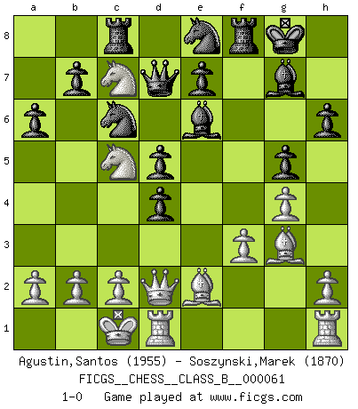 Last move : 1-0 2008 November 17 10:53:41 [Event "FICGS__CHESS__CLASS_B__000061"] [Site "FICGS"] [Date "2008.11.03"] [Round "1"] [White "Agustin,Santos"] [Black "Soszynski,Marek"] [Result "1-0"] [WhiteElo "1955"] [BlackElo "1870"] 1.e4 c6 2.d4 d5 3.Nc3 g6 4.Nf3 Bg7 5.e5 f6 6.Bf4 Bg4 7.exf6 Nxf6 8.Be2 O-O 9.Ng5 Qd7 10.f3 Bf5 11.g4 h6 12.Nh3 Be6 13.Qd2 g5 14.Bg3 c5 15.O-O-O cxd4 16.Nb5 Nc6 17.Nf2 a6 18.Nc7 Rac8 19.Nd3 Ne8 20.Nc5 1-0 Caro-Kann : Gurgenidze system Kingside Castling by player Black (move 8) Queenside Castling by player White (move 15) Player White won this chess game. Follow this game move after move (download)In Fischer's hands, a slight theoretical advantage is as good a being a Queen ahead. (Isaac Kashdan) Der Umstand, daß uns eine 7 Stunden Zeitkontrolle ermöglicht eine großartige, tiefe Partie zu spielen, ist für die Massenmedien nicht weiter von Bedeutung. (Alexej Shirov) Hay jugadores fuertes y personas amables y yo soy un jugador fuerte. (Bobby Fischer) Dans le domaine de la peinture, de la gravure et de la sculpture, dès la première décennie de notre siècle, les artistes abandonnent la représentation de la partie d'échecs pour se concentrer sur les pièces, sur les échiquiers et sur toutes les variations auxquelles les unes et les autres peuvent donner lieu. On passe en quelque sorte d'un thème social à un thème musical (au sens de la musica médiévale, c'est-à-dire d'une notion qui inclue le rythme, l'harmonie, la construction et la déconstruction, etc.). Graphiquement et picturalement, l'échiquier apparaît comme une structure ouverte, dynamique, d'une richesse infinie, autorisant toutes les combinatoires et débouchant sur des mouvements et des rythmes de nature exponentielle. (Michel Pastoureau) The question of whether computers can think is just like question of whether submarines can swim. (Edsger W. Dijkstra)