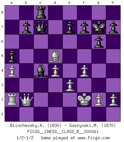 Last move : 1/2-1/2 2008 November 19 9:11:25 [Event "FICGS__CHESS__CLASS_B__000061"] [Site "FICGS"] [Date "2008.11.03"] [Round "1"] [White "Blinchevsky,Alexander"] [Black "Soszynski,Marek"] [Result "1/2-1/2"] [WhiteElo "1830"] [BlackElo "1870"] 1.d4 c6 2.c4 d5 3.Nf3 g6 4.Nc3 Bg7 5.cxd5 cxd5 6.Qb3 Nf6 7.Bf4 Nc6 8.e3 O-O 9.Be2 Na5 10.Qb5 a6 11.Qc5 Nc6 12.O-O Bf5 13.Ne5 Rc8 14.Qa3 Nxe5 15.Bxe5 Ne4 16.Bxg7 Nxc3 17.bxc3 Kxg7 18.Rfc1 Rc6 19.c4 dxc4 20.Bxc4 Qd7 21.Qb2 Rc7 22.Bb3 Rfc8 23.f3 Bd3 24.Kf2 Bb5 25.f4 a5 26.Rxc7 Qxc7 27.a4 Ba6 28.Ra2 Bd3 29.Bd5 Bc4 1/2-1/2 Queen's pawn Kingside Castling by player Black (move 8) Kingside Castling by player White (move 12) This chess game ended in a draw. Follow this game move after move (download)You can only get good at Chess if you love the game. (Bobby Fischer) Offener Brief an US-Präsident Bush anlässlich der Verhaftung Bobby Fishers: Verhaften Sie mich. Stecken Sie mich in dieselbe Zelle wie Bobby Fisher und geben Sie uns ein Schachspiel mit. (Boris Vassilievich Spassky) Yo adoro todas la posiciones. Denme una partida posicional difícil, y la jugaré. Pero posiciones totalmente ganadas, no las tolero. (Hein Donner) Vous savez, camarade Pachman, je n'éprouve pas de plaisir à être ministre, je jouerais plutôt aux échecs comme vous, ou alors ferais une révolution au Venezuela. (Che Guevara à Ludek Pachman, 'Checkmate in Prague', 1975) To send light into the darkness of men's hearts - such is the duty of the artist. (Schumann)
