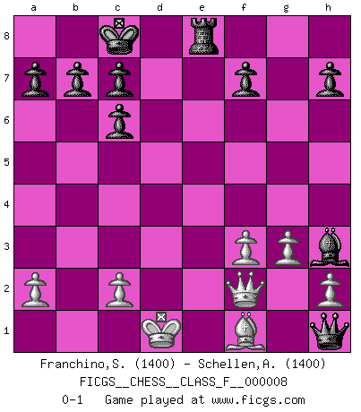 Last move : 0-1 2006 September 5 3:31:41 [Event "FICGS__CHESS__CLASS_F__000008"] [Site "FICGS"] [Date "2006.08.18"] [Round "1"] [White "Franchino,Sebastian"] [Black "Schellen,Anton"] [Result "0-1"] [WhiteElo "1400"] [BlackElo "1400"] 1.e4 e5 2.Nf3 Nc6 3.d4 exd4 4.Nxd4 Bc5 5.Nxc6 Qf6 6.Qe2 dxc6 7.Nc3 Ne7 8.Be3 Ba3 9.Qd2 Bxb2 10.Bd4 Qg6 11.Rd1 Be6 12.g3 Bxc3 13.Bxc3 Qxe4+ 14.Qe2 Qxh1 15.Bxg7 Rg8 16.Bf6 Nd5 17.Bd4 O-O-O 18.f3 Rge8 19.Kd2 Bf5 20.Qf2 Ne3 21.Re1 Rxd4+ 22.Kc1 Rd1+ 23.Rxd1 Nxd1 24.Kxd1 Bh3 0-1 Scotch game Queenside Castling by player Black (move 17) Player Black won this chess game. Follow this game move after move (download)I am the best player in the world and I am here to prove it. (Bobby Fischer) Du weisst es gibt ein Problem mit Computern und Fernschach, wenn jeder eine Rating von 2450 hat. (John Christen Knudsen) Es muy difícil jugar en contra de la teoría de Einstein. - en su primera derrota en contra de Fischer (Mikhail Tal) Une platitude souvent récitée à propos des Echecs est qu'une des choses les plus difficiles à réaliser est de gagner une position gagnante. Cela ne manque pas de sens mais, pour ma part, j'ai toujours trouvé plus difficile de gagner une position perdante. (Tim Krabbe) For a mechanic, you seem to do an excessive amount of thinking. (C-3PO in Star Wars ep.2)