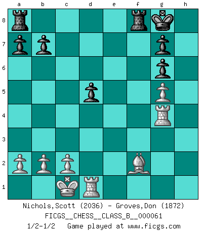 Last move : 1/2-1/2 2008 November 10 3:21:15 [Event "FICGS__CHESS__CLASS_B__000061"] [Site "FICGS"] [Date "2008.11.03"] [Round "1"] [White "Nichols,Scott"] [Black "Groves,Don"] [Result "1/2-1/2"] [WhiteElo "2036"] [BlackElo "1872"] 1.e4 c5 2.d4 cxd4 3.Nf3 e6 4.Nxd4 Nf6 5.Nc3 d6 6.g4 h6 7.h4 Nc6 8.Rg1 d5 9.exd5 Nxd5 10.Nxd5 exd5 11.Bb5 Bd7 12.Be3 Be7 13.Qd3 O-O 14.O-O-O Nxd4 15.Bxd4 Bxh4 16.Bxd7 Qxd7 17.f4 Qd6 18.g5 hxg5 19.fxg5 Qg6 20.Qxg6 fxg6 21.Rg4 Bf2 22.Bxf2 1/2-1/2 Sicilian : Smith-Morra gambit Kingside Castling by player Black (move 13) Queenside Castling by player White (move 14) This chess game ended in a draw. Follow this game move after move (download)I like the moment when I break a man's ego. (Bobby Fischer) Im Internet Chess Club betrug mein Rating vorübergehend 3350 ELO-Punkte. (Sergej Karjakin) El Ajedrez expande y enriquece tu mente. (Saudin Robovic) La vie est comme un jeu d'échecs : nous esquissons un plan, mais celui-ci est tributaire de ce que daignent faire l'adversaire aux échecs et le destin dans la vie. (Arthur Schopenhauer) A person who never made a mistake never tried anything new. (Albert Einstein)