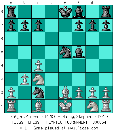 Last move : 0-1 2008 November 21 10:6:6 [Event "FICGS__CHESS__THEMATIC_TOURNAMENT__000064"] [Site "FICGS"] [Date "2008.11.03"] [Round "1"] [White "D Agen,Pierre"] [Black "Hamby,Stephen"] [Result "0-1"] [WhiteElo "1470"] [BlackElo "1921"] 1.d4 d5 2.e4 dxe4 3.c4 Nf6 4.Nc3 e5 5.dxe5 Qxd1+ 6.Nxd1 Ng4 7.Nc3 Nc6 8.Be2 Ngxe5 9.Nxe4 Bf5 10.Nc3 Nd4 11.b3 Nc2+ 0-1 Blackmar gambit Player Black won this chess game. Follow this game move after move (download)Chess is a terrible game. If you have no center, your opponent has a freer position. If you do have a center, then you really have something to worry about ! (Siegbert Tarrasch) Modernes Schach erfordert enorme Anspannung. Es ist für einen normalen Menschen unmöglich das auszuhalten. (Viktor Kortschnoi) Un sacrificio se refuta mucho mejor al aceptarlo. (Wilhelm Steinitz) Les écrivains ont utilisé les échecs pour analyser les côtés extrêmes de la nature humaine. Dans ce cadre, les échecs offrent un champ d'expérimentation idéal. Mais on pourrait faire la même chose avec la peinture. Et là, en vous référant à Van Gogh, vous ne tirerez pas de conclusion définitive sur les peintres. (Gary Kasparov) Life is like a ten-speed bicycle: most of us have gears we never use. (Charles M. Schulz)