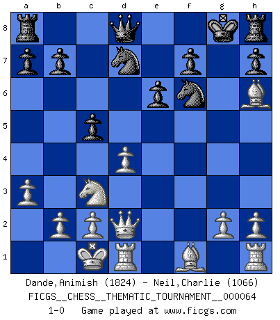 Last move : 1-0 2008 November 15 1:7:35 [Event "FICGS__CHESS__THEMATIC_TOURNAMENT__000064"] [Site "FICGS"] [Date "2008.11.03"] [Round "1"] [White "Dande,Animish"] [Black "Neil,Charlie"] [Result "1-0"] [WhiteElo "1824"] [BlackElo "1066"] 1.d4 d5 2.e4 dxe4 3.Nc3 Nf6 4.f3 exf3 5.Nxf3 Bf5 6.Be3 e6 7.Ne5 Bb4 8.Qd2 Nbd7 9.a3 Bd6 10.Nc4 c5 11.Nxd6+ Ke7 12.Nxf5+ Kf8 13.Nxg7 Kxg7 14.Bh6+ Kg8 15.O-O-O 1-0 Blackmar gambit Queenside Castling by player White (move 15) Player White won this chess game. Follow this game move after move (download)Chess is a sea in which a gnat may drink and an elephant may bathe. (Hindu proverb) Ich rechne überhaupt nicht voraus. Ich gewinne auch so. (Robert James Fischer) Muchos jugadores de Ajedrez se sorprendían cuando después de la partida, Fischer explicaba con calma: 'Yo ya había analizado esta posibilidad' en una posición en la cual yo creía que no era posible de prever desde la apertura. (Mikhail Tal) Le système Elo représente seulement une moyenne. Il est simplement un indicateur de votre stabilité. (Anatoli Karpov) I can't decide which is riskier; taking crazy risks, or taking advice on crazy risks from a crazy risk taker. (Gregory House in House M.D.)