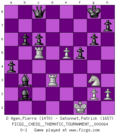Last move : 0-1 2009 July 29 23:53:38 [Event "FICGS__CHESS__THEMATIC_TOURNAMENT__000064"] [Site "FICGS"] [Date "2008.11.03"] [Round "1"] [White "D Agen,Pierre"] [Black "Satonnet,Patrick"] [Result "0-1"] [WhiteElo "1470"] [BlackElo "1657"] 1.d4 d5 2.e4 dxe4 3.Nc3 Nf6 4.Bg5 c6 5.Bxf6 exf6 6.Nxe4 Be6 7.Nf3 Be7 8.Bd3 O-O 9.O-O Nd7 10.c4 Re8 11.Re1 g6 12.b3 Qc7 13.Qd2 Rad8 14.Ng3 f5 15.Re2 Nf6 16.Rae1 a5 17.c5 Nd5 18.a3 Nf4 19.Re5 Nxd3 20.Qxd3 Bf6 21.R5e2 Bg7 22.Ne5 Rd5 23.f4 Red8 24.Rd2 Rxd4 25.Qxd4 Rxd4 26.Rxd4 Bxb3 27.Rd7 Qc8 28.Re7 Bf8 29.Rd7 Bxc5+ 30.Kf1 f6 31.Rc1 fxe5 32.Rd3 Bxa3 33.R1c3 a4 34.fxe5 Bb2 35.Rc5 b6 0-1 Blackmar gambit Kingside Castling by player Black (move 8) Kingside Castling by player White (move 9) Player Black won this chess game. Follow this game move after move (download)After black's reply to 1.e4 with 1..e5, leaves him always trying to get into the game. (Howard Staunton) Habe Mut, dich deines eigenen Verstandes zu bedienen. (Immanuel Kant) Coloca el contenido de las piezas del Ajedrez en un sombrero, agitalo vigorosamente, arrojalas en un tablero desde una altura de 30 centimetros y así obtendras el estilo de Steinitz. (H. E. Bird) Les échecs, c'est l'imagination. (David Bronstein) Home computers are being called upon to perform many new functions, including the consumption of homework formerly eaten by the dog. (Doug Larson)
