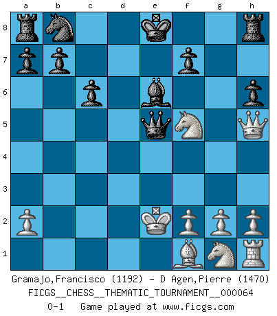 Last move : 0-1 2008 November 17 19:54:20 [Event "FICGS__CHESS__THEMATIC_TOURNAMENT__000064"] [Site "FICGS"] [Date "2008.11.03"] [Round "1"] [White "Gramajo,Francisco"] [Black "D Agen,Pierre"] [Result "0-1"] [WhiteElo "1192"] [BlackElo "1470"] 1.d4 d5 2.e4 dxe4 3.Nc3 Nf6 4.d5 e6 5.Bg5 h6 6.Bxf6 gxf6 7.Nxe4 c6 8.Qh5 f5 9.dxe6 Bxe6 10.Ng3 Bg7 11.Nxf5 Qa5+ 12.c3 Bxc3+ 13.bxc3 Qxc3+ 14.Kd1 Qxa1+ 15.Ke2 Qe5+ 0-1 Blackmar gambit Player Black won this chess game. Follow this game move after move (download)A Chess game is a dialogue, a conversation between a player and his opponent. Each move by the opponent may contain threats or be a blunder, but a player cannot defend against threats or take advantage of blunders if he does not first ask himself: What is my opponent planning after each move ? (Bruce A. Moon) Ich moechte nie einem Club beitreten, der Leute wie mich als Mitglieder aufnimmt. (Woody Allen) No hay un Gran Maestro de Ajedrez que sea normal; solo se diferencían ellos por la magnitud de su locura. (Viktor Korchnoi) Vous savez, camarade Pachman, je n'éprouve pas de plaisir à être ministre, je jouerais plutôt aux échecs comme vous, ou alors ferais une révolution au Venezuela. (Che Guevara à Ludek Pachman, 'Checkmate in Prague', 1975) We're missing something. (Gregory House, House M.D.)