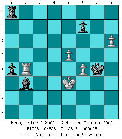Last move : 0-1 2007 May 27 7:41:13 [Event "FICGS__CHESS__CLASS_F__000008"] [Site "FICGS"] [Date "2006.08.18"] [Round "1"] [White "Mena,Javier"] [Black "Schellen,Anton"] [Result "0-1"] [WhiteElo "1200"] [BlackElo "1400"] 1.d4 Nf6 2.c4 e6 3.Nc3 Bb4 4.Qc2 O-O 5.a3 Bxc3+ 6.Qxc3 b6 7.Bg5 Bb7 8.e3 d6 9.f3 h6 10.Bh4 Nbd7 11.Bd3 c5 12.Ne2 Rc8 13.O-O Ba6 14.b4 cxd4 15.Qxd4 Ne5 16.b5 Bb7 17.Rad1 Qe7 18.Ng3 Nxd3 19.Bxf6 Qxf6 20.Qxf6 gxf6 21.Rxd3 Rfd8 22.Rd4 Kf8 23.Rfd1 Ke7 24.a4 Rc5 25.Kf2 Rd7 26.Nf1 f5 27.Rh4 d5 28.cxd5 R7xd5 29.Rxd5 Bxd5 30.Nd2 Rc2 31.Ke1 Ra2 32.Rf4 Kd6 33.g3 Kc5 34.Rh4 e5 35.Kd1 Be6 36.h3 Rb2 37.e4 f4 38.gxf4 exf4 39.Rxh6 Ra2 40.h4 Rxa4 41.Rh8 Ra1+ 42.Kc2 Kd4 43.Rd8+ Ke3 44.Rd3+ Ke2 45.Rd4 Ra5 46.e5 Rxb5 47.Re4+ Kf2 48.Kc1 Rc5+ 49.Kd1 Bf5 50.h5 a5 51.h6 Rc6 52.Rxf4 Bd3 53.Nb3 Bc2+ 54.Kd2 Bxb3 55.Rf6 Rc8 56.Rxb6 a4 57.f4 Kf3 58.Rb4 Kg4 59.Ke3 Ra8 0-1 Nimzo-Indian : Classical variation Kingside Castling by player Black (move 4) Kingside Castling by player White (move 13) 10 pieces endgame at move 56 : White KRPPP , Black KRBPP WHITE : King + 1 Rook 3 Pawns BLACK : King + 1 Rook 1 Bishop 2 Pawns Player Black won this chess game. Follow this game move after move (download)Personally, I rather look forward to a computer program winning the world Chess Championship. Humanity needs a lesson in humility. (Richard Dawkings) Der Partner hat auch seine Existenzberechtigung. (Savielly Grigorievitsch Tartakower) Las Aperturas te enseñan aperturas. ¡Los Finales te enseñan Ajedrez!. (Stephan Gerzadowicz) Celui qui prend des risques peut perdre, celui qui n'en prend pas perd toujours. (Xavier Tartacover) The beginning is the most important part of the work. (Plato)