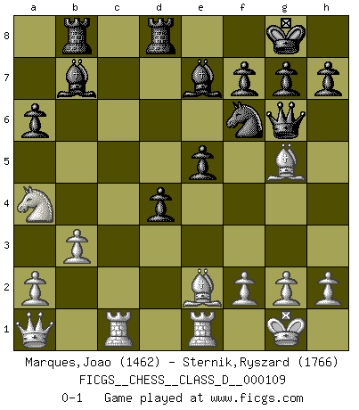 Last move : 0-1 2008 November 18 14:1:34 [Event "FICGS__CHESS__CLASS_D__000109"] [Site "FICGS"] [Date "2008.11.05"] [Round "1"] [White "Marques,Joao"] [Black "Sternik,Ryszard"] [Result "0-1"] [WhiteElo "1462"] [BlackElo "1766"] 1.e4 c5 2.Nf3 Nc6 3.d4 cxd4 4.Nxd4 Nf6 5.Nc3 d6 6.Be2 e6 7.Be3 Be7 8.O-O O-O 9.Qd2 a6 10.Nxc6 bxc6 11.Rad1 Qc7 12.Bg5 d5 13.exd5 cxd5 14.Qf4 Qb6 15.Qc1 Rd8 16.Bd3 Rb8 17.b3 e5 18.Qa1 Qc7 19.Be2 Bb7 20.Na4 d4 21.Rfe1 Qxc2 22.Rc1 Qg6 0-1 Sicilian : Classical Kingside Castling by player White (move 8) Kingside Castling by player Black (move 8) Player Black won this chess game. Follow this game move after move (download)Chess is mental torture. (Garry Kasparov) Wir können eben der zündenden Macht des Opfers nicht wiederstehen, denn die Begeisterung für das Opfer liegt in der Natur des Menschen. (Rudolf Spielmann) Realmente no sabemos como el juego fue inventado, aunque hay sospechas. Tan pronto como descubramos a los culpables, se los haremos saber. (Bruce Pandolfini) Aux échecs, les retours au sommet sont rares : les dommages psychologiques consécutifs à une défaite sont trop sévères. (Daily Telegraph) Cactus - It is depressed cucumber. (Ilmars Cirulis)