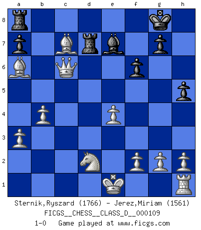 Last move : 1-0 2009 January 23 1:52:5 [Event "FICGS__CHESS__CLASS_D__000109"] [Site "FICGS"] [Date "2008.11.05"] [Round "1"] [White "Sternik,Ryszard"] [Black "Jerez,Miriam"] [Result "1-0"] [WhiteElo "1766"] [BlackElo "1561"] 1.b4 b5 2.Bb2 Na6 3.a3 c6 4.Nf3 Nf6 5.d3 d5 6.Nbd2 Qd6 7.e4 dxe4 8.dxe4 e5 9.c4 Be7 10.cxb5 cxb5 11.Bxb5+ Nd7 12.Rc1 O-O 13.Rc6 Qd3 14.Bxd3 Bb7 15.Rxa6 Bxa6 16.Bxa6 Rfd8 17.Nxe5 Nxe5 18.Bxe5 f6 19.Bc7 Rd7 20.Qc2 h5 21.Qc6 1-0 Polish (Sokolsky) opening Kingside Castling by player Black (move 12) Player White won this chess game. Follow this game move after move (download)An attack on the wing should be met by play in the center. (Nimzovitch) Es ist nicht das erste mal, dass sich die FIDE dem Arabischen Geld gebeugt hat (über die FIDE WM 2004 in Lybien). (Larry Evans) De todos mis libros Rusos, la defensa contiene y difunde el 'calor' mas grande que pudiese verse extraño al observar lo supremamente abstracto que el Ajedrez supuestamente es. (Vladimir Nabokov) Il a essayé de se convaincre qu'il pourrait empêcher toutes les erreurs et ne jamais perdre. L'horreur ! Gary Kasparov au sujet de Robert Fischer. You think that education is too expensive ? Try ignorance. (Derek Bok)