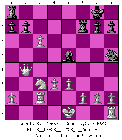 Last move : 1-0 2008 December 15 9:32:36 [Event "FICGS__CHESS__CLASS_D__000109"] [Site "FICGS"] [Date "2008.11.05"] [Round "1"] [White "Sternik,Ryszard"] [Black "Denchev,Stanimir"] [Result "1-0"] [WhiteElo "1766"] [BlackElo "1564"] 1.b4 e5 2.Bb2 Nc6 3.b5 Nd4 4.e3 Nf5 5.Bxe5 d5 6.Nf3 Nf6 7.c4 Be7 8.cxd5 Qxd5 9.Nc3 Qc5 10.Rc1 Nh4 11.Bd4 Nxf3+ 12.Qxf3 Qa3 13.Rc2 O-O 14.Bc4 Qb4 15.d3 c5 16.bxc6 Bg4 17.Qf4 Bd6 18.Be5 Nh5 19.Qxg4 Bxe5 20.Bxf7+ Rxf7 21.Qxb4 1-0 Polish (Sokolsky) opening Kingside Castling by player Black (move 13) Player White won this chess game. Follow this game move after move (download)A good player is always lucky. (Jose Raul Capablanca) Deine Wertungszahl - vorausgesetzt einige Jahre schachliche Anstrengung - entspricht etwa dem zehnfachen Deines IQ plus 1000. (Jonathan Levitt) ¿Porque tengo que perder ante este idiota?. (Aron Nimzovich) Assurément je connaissais par expérience le mystérieux attrait de ce jeu royal, le seul entre tous les jeux inventés par les hommes qui échappe souverainement à la tyrannie du hasard, le seul où l'on ne doive sa victoire qu'à son intelligence ou plutôt à une certaine forme d'intelligence. Mais n'est-ce pas déjà le limiter injurieusement que d'appeler les échecs un jeu ? N'est-ce pas une science, un art ou quelque chose qui, comme le cercueil de Mahomet entre ciel et terre, est suspendu entre l'un et l'autre, et qui réunit un nombre incroyable de contraires ? [...] C'est une pensée qui ne mène à rien, une mathématique qui n'établit rien, un art qui ne laisse pas d'uvre, une architecture sans matière; et il l'a prouvé néanmoins qu'il était plus durable, à sa manière, que les livres ou que tout autre monument, ce jeu unique qui appartient à tous les peuples et à tous les temps, et dont personne ne sait quel dieu en fit don à la terre pour tuer l'ennui, pour aiguiser l'esprit et stimuler l'âme. Où commence-t-il, où finit-il ? (Stefan Zweig) You can think I'm wrong, but that's no reason to quit thinking. (Gregory House, House M.D.)