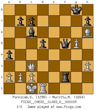 Last move : 1-0 2009 August 23 9:19:23 [Event "FICGS__CHESS__CLASS_D__000109"] [Site "FICGS"] [Date "2008.11.05"] [Round "1"] [White "Porkolab,Sandor"] [Black "Murittu,Massimiliano"] [Result "1-0"] [WhiteElo "1298"] [BlackElo "1654"] 1.e4 e5 2.d4 exd4 3.Qxd4 Nc6 4.Qe3 Nf6 5.Nc3 Bb4 6.Bd2 O-O 7.O-O-O Re8 8.Bc4 d6 9.Nf3 Be6 10.Bd3 Bc5 11.Qe2 Bg4 12.Be3 Bb4 13.Nd5 Nxe4 14.h3 Bf5 15.g4 Bd7 16.Bxe4 Rxe4 17.Qd3 Re6 18.Ng5 Rg6 19.Nxf7 Kxf7 20.Nxb4 Nxb4 21.Qb3+ Re6 22.Qxb4 Bc6 23.Rhe1 Qf6 24.Rd4 a5 25.Qc4 d5 26.Qc3 Kg8 27.g5 Qe7 28.R4d1 a4 29.Bf4 Rf8 30.Rxe6 Qxe6 31.Be5 Rxf2 32.Bxg7 Qf5 33.Bh6 1-0 Centre game : Berger variation Kingside Castling by player Black (move 6) Queenside Castling by player White (move 7) Player White won this chess game. Follow this game move after move (download)You have to have the fighting spirit. You have to force moves and take chances. (Bobby Fischer) Die unerbitterlichsten Regeln im Schach sind die Ausnahmen. (Savielly Grigorievitsch Tartakower) Nada excita más a Grandes Maestros aburridos que una novedad teórica. (Dominic Lawson) Dans le domaine de la peinture, de la gravure et de la sculpture, dès la première décennie de notre siècle, les artistes abandonnent la représentation de la partie d'échecs pour se concentrer sur les pièces, sur les échiquiers et sur toutes les variations auxquelles les unes et les autres peuvent donner lieu. On passe en quelque sorte d'un thème social à un thème musical (au sens de la musica médiévale, c'est-à-dire d'une notion qui inclue le rythme, l'harmonie, la construction et la déconstruction, etc.). Graphiquement et picturalement, l'échiquier apparaît comme une structure ouverte, dynamique, d'une richesse infinie, autorisant toutes les combinatoires et débouchant sur des mouvements et des rythmes de nature exponentielle. (Michel Pastoureau) When you stop learning you start dying. (M. Scott Adams)