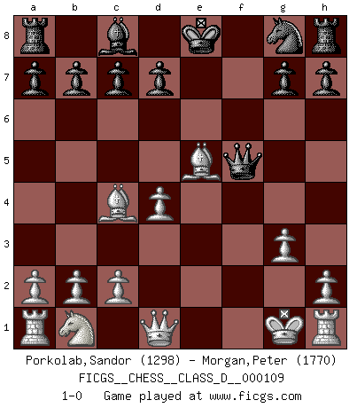 Last move : 1-0 2008 December 28 14:25:2 [Event "FICGS__CHESS__CLASS_D__000109"] [Site "FICGS"] [Date "2008.11.05"] [Round "1"] [White "Porkolab,Sandor"] [Black "Morgan,Peter"] [Result "1-0"] [WhiteElo "1298"] [BlackElo "1770"] 1.e4 e5 2.Nf3 f5 3.Nxe5 Bc5 4.Bc4 Bxf2+ 5.Kxf2 Qh4+ 6.g3 Qf6 7.d4 Nc6 8.Bf4 Nxe5 9.Bxe5 Qg6 10.exf5 Qxf5+ 11.Kg1 1-0 Latvian counter-gambit Player White won this chess game. Follow this game move after move (download)All my games are real. (Bobby Fischer) Ein Springer auf f6 gegen die eigene Rochadestellung ist schlimmer als ein rostiger Nagel im Knie. (Efim Bogoljubov) Creo que una cierta cantidad de temperamento es esperada de los genios del Ajedrez. (Ron Gross) A chaque perte on perd un peu de soi. (Joël Lautier) Political correctness is subjecting us to gross incompetence. (Johann Piek)