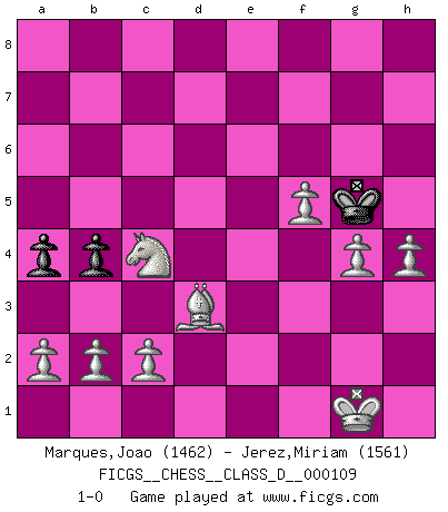 Last move : 1-0 2009 May 28 3:49:1 [Event "FICGS__CHESS__CLASS_D__000109"] [Site "FICGS"] [Date "2008.11.05"] [Round "1"] [White "Marques,Joao"] [Black "Jerez,Miriam"] [Result "1-0"] [WhiteElo "1462"] [BlackElo "1561"] 1.e4 e5 2.Nf3 Nc6 3.Bb5 Nge7 4.O-O a6 5.Ba4 b5 6.Bb3 g6 7.Nc3 Bh6 8.d4 Bxc1 9.Rxc1 exd4 10.Nxd4 Nxd4 11.Qxd4 O-O 12.f4 d6 13.Rcd1 c5 14.Qxd6 Qxd6 15.Rxd6 c4 16.Bxc4 h5 17.Bd3 Bb7 18.Rd7 Bc6 19.Rxe7 b4 20.Ne2 a5 21.Nd4 Rfd8 22.Nxc6 Rdc8 23.Ne5 Kf8 24.Rxf7+ Ke8 25.Rg7 Kf8 26.Rxg6 Ra7 27.Rh6 Kg7 28.Rxh5 Kf6 29.Rh6+ Kg7 30.Rg6+ Kh7 31.f5 Rc5 32.Nc4 a4 33.Re6 Kg7 34.f6+ Kf7 35.Re7+ Rxe7 36.fxe7 Kxe7 37.Rf5 Rxf5 38.exf5 Kf6 39.g4 Kg5 40.h4+ 1-0 Ruy Lopez : Cozio defense Kingside Castling by player White (move 4) Kingside Castling by player Black (move 11) Player White won this chess game. Follow this game move after move (download)One of these modest little moves may be more embarrassing to your opponent than the biggest threat. (Siegbert Tarrasch) Ein guter Spieler hat immer Glück. (José Raúl Capablanca) Con el tiempo, empecé a progresar en partidas decisivas. Tal vez porque me di cuenta de una simple verdad: no solo estaba yo nervioso sino también mi oponente. (Mikhail Tal) Je crois qu'il existe des manières très spécifiques de jouer efficacement contre une machine. Evidemment, nous n'avons aucune chance en technique pure, parce que l'ordinateur calcule de manière parfaite. Mais lorsque nous faisons appel à notre cerveau, en utilisant l'intuition et la compréhension, alors nous restons beaucoup plus forts. (Anatoli Karpov) CHESS, n. f. [echecs, Fr.] A nice and abstruse game, in which two sets of puppets are moved in opposition to each other. (Dr Samuel Johnson, A Dictionary Of The English Language, 1755)