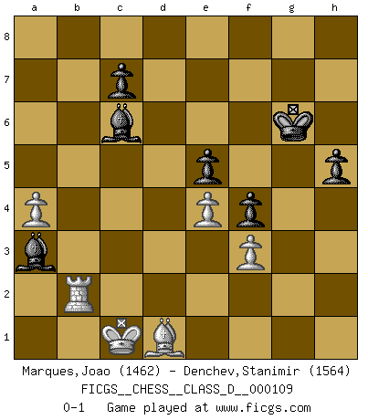Last move : 0-1 2009 February 27 11:14:51 [Event "FICGS__CHESS__CLASS_D__000109"] [Site "FICGS"] [Date "2008.11.05"] [Round "1"] [White "Marques,Joao"] [Black "Denchev,Stanimir"] [Result "0-1"] [WhiteElo "1462"] [BlackElo "1564"] 1.d4 d5 2.Nc3 Nc6 3.Nf3 Nf6 4.Bg5 Ne4 5.Nxe4 dxe4 6.Ne5 Nxd4 7.Bh4 Be6 8.e3 Nf5 9.Bg3 Nxg3 10.hxg3 a6 11.Qxd8+ Rxd8 12.a3 f6 13.Nc4 Bd5 14.O-O-O e5 15.Be2 b5 16.Nd2 Bc5 17.Rh4 Kf7 18.Rdh1 h6 19.Bh5+ g6 20.Be2 Bf8 21.c4 Bc6 22.cxb5 axb5 23.Bd1 Bg7 24.Bc2 f5 25.f3 exf3 26.gxf3 Rd6 27.e4 Rhd8 28.Rd1 g5 29.R4h1 f4 30.gxf4 gxf4 31.Rh5 b4 32.Nc4 Rxd1+ 33.Bxd1 bxa3 34.bxa3 Kg6 35.Rh2 Rd4 36.Nb2 Bf8 37.a4 Ba3 38.Bc2 Rb4 39.Bd1 Rxb2 40.Rxb2 h5 0-1 Queen's pawn : Chigorin variation Queenside Castling by player White (move 14) Player Black won this chess game. Follow this game move after move (download)Fischer was a master of clarity and a king of artful positioning. His opponents would see where he was going but were powerless to stop him. (Bruce Pandolfini) Frage des Reporters: -Welche besonderen Umstände rechtfertigen das Anhalten der Uhren während einer Turnierpartie? Antwort: -Einen Fotographen zu strangulieren. (Siegbert Tarrasch) Un jugador que es sorprendido, esta derrotado a medias. (Proverbio) Comme les marins qui ont mille raisons différentes d'aller en mer, les joueurs d'échecs en ont tout autant avant de s'installer devant une table et jouer... (Vincent Bertignac, philosophe) Tomorrow's what you make of it. (Horatio Caine, C.S.I. Miami)