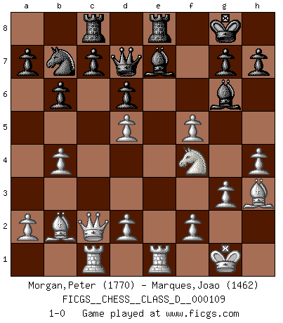 Last move : 1-0 2009 February 9 14:10:4 [Event "FICGS__CHESS__CLASS_D__000109"] [Site "FICGS"] [Date "2008.11.05"] [Round "1"] [White "Morgan,Peter"] [Black "Marques,Joao"] [Result "1-0"] [WhiteElo "1770"] [BlackElo "1462"] 1.c4 e5 2.Nc3 Nf6 3.Nf3 Be7 4.Nxe5 O-O 5.g3 d6 6.Nd3 Nc6 7.Bg2 Bd7 8.O-O Rb8 9.b3 Bf5 10.Bb2 Qd7 11.Nd5 Nxd5 12.cxd5 Na5 13.Qc2 b6 14.b4 Nb7 15.Rac1 Rbc8 16.e4 Bg6 17.h4 Qg4 18.Rfe1 Rfe8 19.Nf4 Qd7 20.Bh3 f5 21.exf5 1-0 English Opening Kingside Castling by player Black (move 4) Kingside Castling by player White (move 8) Player White won this chess game. Follow this game move after move (download)Dazzling combinations are for the many, shifting wood is for the few. (Georg Kieninger) Auf Remis zu spielen ist gewissermaßen ein Verbrechen gegen das Schachspiel. (Mikhail Nekhemyevich Tal) Solo puedes ser bueno en el Ajedrez si amas al juego. (Bobby Fischer) C'est une question de caractère, Beaucoup de gens perdent leur motivation très vite. D'autres, ils sont rares, peuvent la conserver très longtemps. J'aime les échecs, encore aujourd'hui je suis heureux d'analyser des parties. J'aime toujours gagner, je déteste encore perdre. Bien jouer est important pour mon intégrité intellectuelle et morale. Et puis les échecs vivent en ce moment une période historique grâce à Internet. Ils se développent dans les systèmes éducatifs à travers le monde. Ils sortent de leur ghetto, et c'est mon rôle de mener à bien cette révolution. (Gary Kasparov) The large trees attract high winds. (Chinese proverb)
