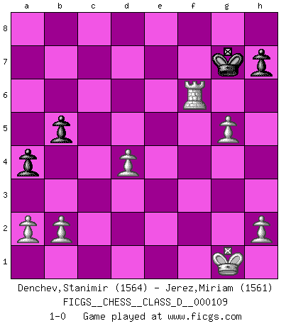 Last move : 1-0 2009 April 18 21:53:19 [Event "FICGS__CHESS__CLASS_D__000109"] [Site "FICGS"] [Date "2008.11.05"] [Round "1"] [White "Denchev,Stanimir"] [Black "Jerez,Miriam"] [Result "1-0"] [WhiteElo "1564"] [BlackElo "1561"] 1.c3 e5 2.d3 d5 3.Qc2 c5 4.e4 d4 5.Nf3 Nc6 6.Nbd2 Nf6 7.Be2 Be7 8.Nc4 O-O 9.Ncxe5 Nxe5 10.Nxe5 b6 11.O-O Bb7 12.f4 Bd6 13.Nf3 Nh5 14.e5 Bc7 15.g4 Bxf3 16.Bxf3 Nxf4 17.Bxf4 f6 18.Bxa8 Qxa8 19.exf6 Bxf4 20.Rxf4 gxf6 21.Raf1 Qb7 22.cxd4 cxd4 23.Qc4+ Qf7 24.Qxf7+ Rxf7 25.Rxd4 a5 26.Rd6 b5 27.R1xf6 Rxf6 28.Rxf6 Kg7 29.g5 a4 30.d4 1-0 Saragossa Opening Kingside Castling by player Black (move 8) Kingside Castling by player White (move 11) Player White won this chess game. Follow this game move after move (download)War is the child of passion, passion is the child of narcissism and narcissism is the child. (...) Another game ? (Thibault de Vassal) Man kann eine Schachpartie nur gewinnen, wenn das Gleichgewicht gestört ist. In einer Stellung mit ungestörtem Gleichgewicht ist auch das größte Genie hilflos - in der Stellung steckt dann eben kein genialer Einfall. (Wilhelm Steinitz) Yo siempre he tenido un ligero sentimiento de lástima por una persona que no tiene conocimiento del Ajedrez. (Siegbert Tarrasch) J'apprécie les joueurs d'est-indienne, c'est grâce à eux que je nourris ma famille depuis tant d'années. (Petrosian) Two beer, or not two beer. (Unknown)