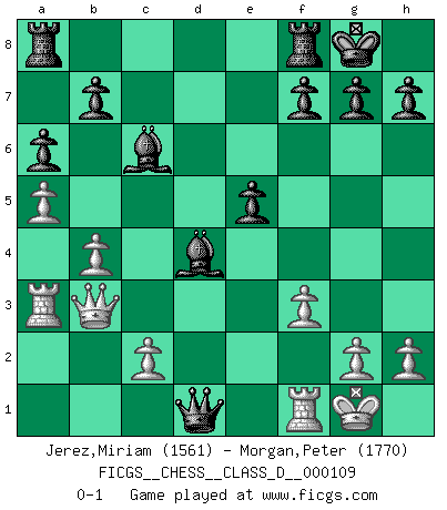 Last move : 0-1 2009 April 25 0:49:10 [Event "FICGS__CHESS__CLASS_D__000109"] [Site "FICGS"] [Date "2008.11.05"] [Round "1"] [White "Jerez,Miriam"] [Black "Morgan,Peter"] [Result "0-1"] [WhiteElo "1561"] [BlackElo "1770"] 1.e4 e5 2.Nf3 Nc6 3.Nc3 Nf6 4.Bc4 Bc5 5.O-O O-O 6.d3 d6 7.b3 Nd4 8.Nxd4 Bxd4 9.Bb2 c6 10.a4 d5 11.exd5 cxd5 12.Bb5 a6 13.Nxd5 Bxb2 14.Ra2 Qxd5 15.Bc4 Qd4 16.Qb1 Bc3 17.a5 Bd7 18.b4 Ne4 19.dxe4 Qxc4 20.Ra3 Bc6 21.Qb3 Qxe4 22.f3 Qd4+ 23.Rf2 Qd1+ 24.Rf1 Bd4+ 0-1 Four knights : Italian variation Kingside Castling by player White (move 5) Kingside Castling by player Black (move 5) Player Black won this chess game. Follow this game move after move (download)Chess is imagination. (David Bronstein) Ich möchte Schüler heranbilden, die das Vermögen haben, selbst zu denken und Kritik zu üben. (Emanuel Lasker) Repentinamente, me resultaba obvio en mi analisis que yo había pasado por alto lo que Fischer había visto en el tablero con la mas grande facilidad. (Mikhail Botvinnik) Aidez vos pièces, elles vous aideront. (Paul Morphy) It is a good thing for an uneducated man to read books of quotations. (Winston Churchill)