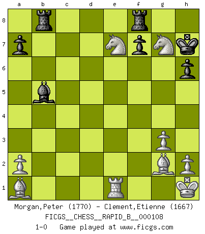 Last move : 1-0 2009 February 9 8:52:0 [Event "FICGS__CHESS__RAPID_B__000108"] [Site "FICGS"] [Date "2008.11.05"] [Round "1"] [White "Morgan,Peter"] [Black "Clement,Etienne"] [Result "1-0"] [WhiteElo "1770"] [BlackElo "1667"] 1.c4 Nf6 2.Nc3 e6 3.Nf3 d5 4.cxd5 exd5 5.g3 Bd6 6.Bg2 c6 7.O-O O-O 8.d4 Be6 9.Ng5 Bg4 10.Qb3 Qd7 11.f3 Bf5 12.e4 dxe4 13.fxe4 Bg6 14.e5 Be7 15.exf6 Bxf6 16.d5 Bd4+ 17.Kh1 cxd5 18.Bh3 Qc6 19.Nxd5 Qc5 20.Qxb7 Nc6 21.Bg2 Rae8 22.Bf4 Bd3 23.Rfd1 Be2 24.Re1 h6 25.Ne4 Qb5 26.Qd7 Bxb2 27.Nd6 Ne5 28.Ne7+ Kh8 29.Qxb5 Bxb5 30.Bxe5 Bxa1 31.Bxa1 Rb8 32.Ndf5 Kh7 33.Nxg7 1-0 This chess game has been lost on time (started : 2008.11.05 13:43:20) English Opening Kingside Castling by player White (move 7) Kingside Castling by player Black (move 7) Player White won this chess game. Follow this game move after move (download)The winner of the game is the player who makes the next-to-last mistake. (Savielly Tartakover) Mit Schach schule ich mein Gefühl für Geometrie, was für Tennis und Schach gleichermaßen wichtig ist. (Boris Becker) El Ajedrez es una hermosa aventura. (Bent Larsen) Même un GMI sait rarement calculer sur plus de cinq coups une attaque à sacrifices. (Rudolf Spielmann) Logic : The art of thinking and reasoning in strict accordance with the limitations and incapacities of the human misunderstanding. (Ambrose Bierce)