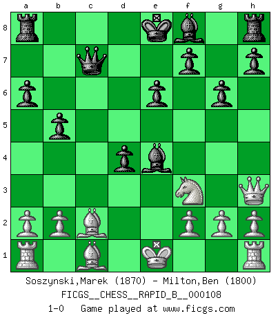 Last move : 1-0 2008 December 30 16:48:49 [Event "FICGS__CHESS__RAPID_B__000108"] [Site "FICGS"] [Date "2008.11.05"] [Round "1"] [White "Soszynski,Marek"] [Black "Milton,Ben"] [Result "1-0"] [WhiteElo "1870"] [BlackElo "1800"] 1.e4 c5 2.d4 cxd4 3.Qxd4 Nc6 4.Qe3 Nf6 5.e5 Ng4 6.Qe4 Ngxe5 7.Bb5 e6 8.Nc3 a6 9.Ba4 b5 10.Bb3 d5 11.Qe2 Bb7 12.Qh5 g6 13.Qh3 d4 14.Ne4 Nb4 15.Nf3 Bxe4 16.Nxe5 Qc7 17.Nf3 Nxc2+ 18.Bxc2 1-0 This chess game has been lost on time (started : 2008.11.05 13:43:20) Comment by player 2 : Ben Milton : do you use an engine? Sicilian : Smith-Morra gambit Player White won this chess game. Follow this game move after move (download)There's never before been a Chess player with such a thorough knowledge of the intricacies of the game and such an absolutely indomitable will to win. I think Bobby is the greatest player that ever lived. (Lisa Lane) Ich habe Kasparov in Rente geschickt. (Veselin Topalov) Uno no tiene que jugar muy bien, es suficiente jugar mejor que el oponente. (Siegbert Tarrasch) L'ordinateur a tué l'originalité. Il n'y a plus guère d'aventures sur l'échiquier. (Jacob Murray) The best weapon against an enemy is another enemy. (Friedrich Nietzsche)
