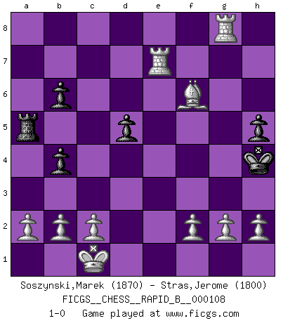 Last move : 1-0 2009 January 5 22:33:46 [Event "FICGS__CHESS__RAPID_B__000108"] [Site "FICGS"] [Date "2008.11.05"] [Round "1"] [White "Soszynski,Marek"] [Black "Stras,Jerome"] [Result "1-0"] [WhiteElo "1870"] [BlackElo "1800"] 1.e4 e5 2.d4 exd4 3.Qxd4 Nc6 4.Qe3 Qf6 5.Nc3 Bb4 6.Bd2 Nd4 7.O-O-O Qb6 8.Nd5 Qc5 9.Nxb4 c6 10.Bc3 Ne6 11.Qxc5 Nxc5 12.Bxg7 d5 13.exd5 a5 14.Re1+ Ne7 15.Bxh8 axb4 16.Bf6 cxd5 17.Bb5+ Kf8 18.Bxe7+ Kg8 19.Bxc5 Ra5 20.Re8+ Kg7 21.Bd4+ f6 22.Rxc8 Rxb5 23.Ra8 b6 24.Nf3 h5 25.Re1 Ra5 26.Re7+ Kg6 27.Nh4+ Kg5 28.Rg8+ Kxh4 29.Bxf6+ 1-0 Centre game : Paulsen attack Queenside Castling by player White (move 7) Player White won this chess game. Follow this game move after move (download)When in doubt... play Chess ! (Tevis) Zum Sieg gelangt man nicht, wenn man gut, sondern nur wenn man besser spielt (Savielly Grigorievitsch Tartakower) La caracteristica mas importante en la posición del Ajedrez es la actividad de las piezas. Esto es absolutamente fundamental en todas las fases del juego: Apertura, Juego Medio y especialmente Finales. La limitación primordial en la actividad de una pieza, es la estructuración de los Peones. (Michael Stean) Je fais ceci parce que dans cinquante coups j'obtiendrai cela; je m'appelle Mikhail Moisevitch Botvinnik. (Botvinnik) A mistake is only a mistake if you let it happen twice. Otherwise it is a learning experience. (Daniel Parmet)
