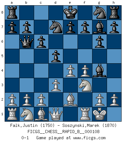 Last move : 0-1 2008 November 14 19:19:35 [Event "FICGS__CHESS__RAPID_B__000108"] [Site "FICGS"] [Date "2008.11.05"] [Round "1"] [White "Falk,Justin"] [Black "Soszynski,Marek"] [Result "0-1"] [WhiteElo "1750"] [BlackElo "1870"] 1.f4 c6 2.Nf3 d5 3.e3 g6 4.Be2 Bg4 5.O-O Bg7 6.d3 Nd7 7.e4 Qb6+ 0-1 Bird's Opening Kingside Castling by player White (move 5) Player Black won this chess game. Follow this game move after move (download)A great player and a great example for many. His book My 60 Memorable Games had a big impact on me. It is a shame he didn't continue to enrich the world of chess with his unparalleled understanding after 1972. (Jan Timman, about Bobby Fischer's death) Nach Morphy wurde nichts neues mehr in der Behandlung offener Positionen gefunden. (Mikhail Moiseyevich Botvinik) Debes de llevar a tu oponente hacia un profundo y obscuro bosque donde 2+2=5, y el camino que conduce a la salida es suficientemente ancho para solamente uno. (Mikhail Tal) On entre au jeu d'Echecs comme on entre en Religion. Pour le joueur d'Echecs, la partie d'Echecs c'est l'office, la messe, le défilé du 1er Mai, le dépôt de gerbe au Monument aux Morts. C'est un drame sacré. (Michel Roos) Computers have lots of memory but no imagination. (Anonymous)