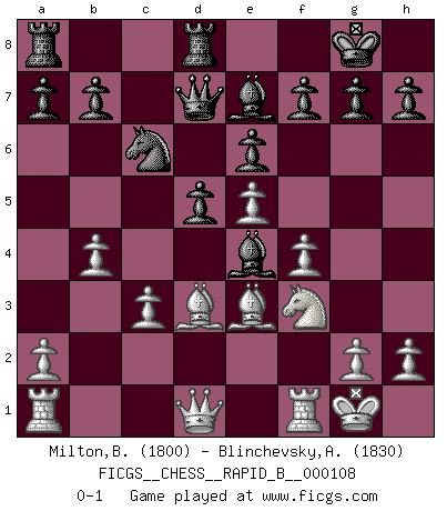 Last move : 0-1 2008 December 28 16:24:54 [Event "FICGS__CHESS__RAPID_B__000108"] [Site "FICGS"] [Date "2008.11.05"] [Round "1"] [White "Milton,Ben"] [Black "Blinchevsky,Alexander"] [Result "0-1"] [WhiteElo "1800"] [BlackElo "1830"] 1.e4 c6 2.d4 d5 3.e5 Bf5 4.Nf3 e6 5.c3 Nd7 6.Be2 c5 7.O-O Ne7 8.dxc5 Nxc5 9.Nd4 Bg6 10.Be3 Nc6 11.f4 Qd7 12.Nd2 Be7 13.N4f3 O-O 14.b4 Ne4 15.Nxe4 Bxe4 16.Bd3 Rfd8 0-1 This chess game has been lost on time (started : 2008.11.05 13:43:20) Caro-Kann : Advance variation Kingside Castling by player White (move 7) Kingside Castling by player Black (move 13) Player Black won this chess game. Follow this game move after move (download)Bobby just drops the pieces and they fall on the right squares. (Miguel Najdorf) Frage: Wie viele Autos haben Sie schon zerstört? - Antwort: Nur zwei. (Loek van Wely) Un entendimiento a fondo de las continuaciones típicas del mate, hace de las combinaciones de sacrificio mas complicadas conducirlas a ellas no solo sin dificultad, sino casi de una manera natural. (Siegbert Tarrasch) Je ne suis pas le dernier à jouer lâchement des coups douteux pendant le zeïtnot de l'adversaire pour l'achever: en effet les coups qui font le plus peur sont ceux que l'on ne comprend pas. Je me fais souvent peur quand je joue. (Un professeur anonyme) Chess is as much a mystery as women. (Purdy)